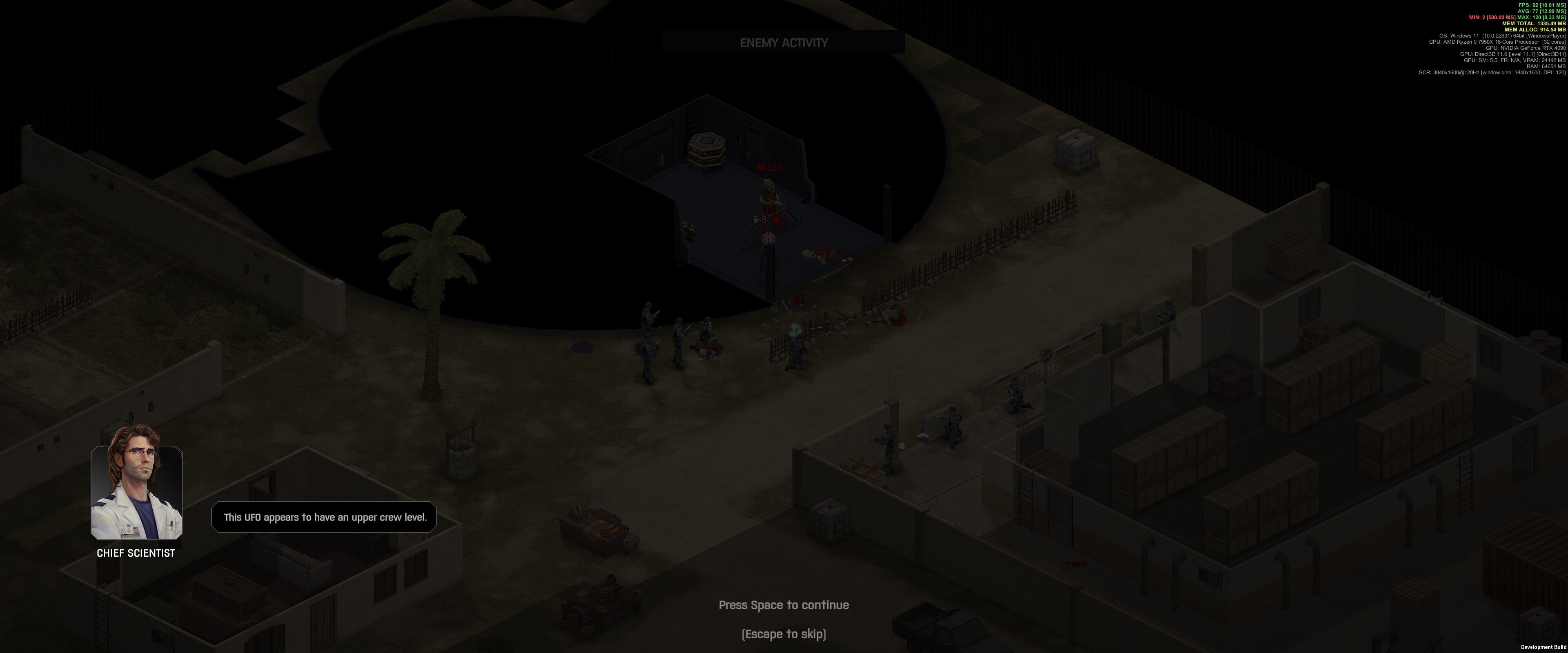 First mission on Observer (I think) UFO, the Chief Scientist comes onscreen and tells the player about the UFO having a upper level and look for teleporters. I think this is supposed to trigger when a Xenonaut sees some distance inside the UFO, but in my playthrough that triggered during the alien turn so I can't properly see what the aliens are doing while the Chief Scientist is talking over the turn.