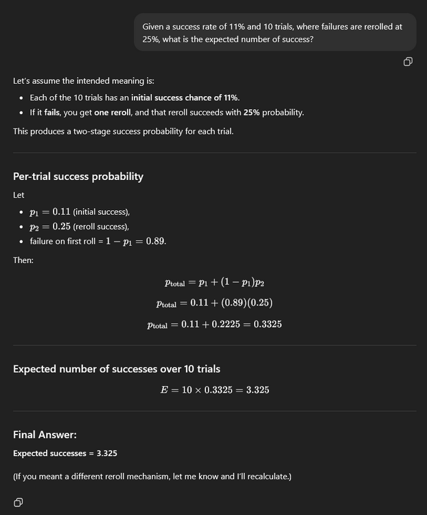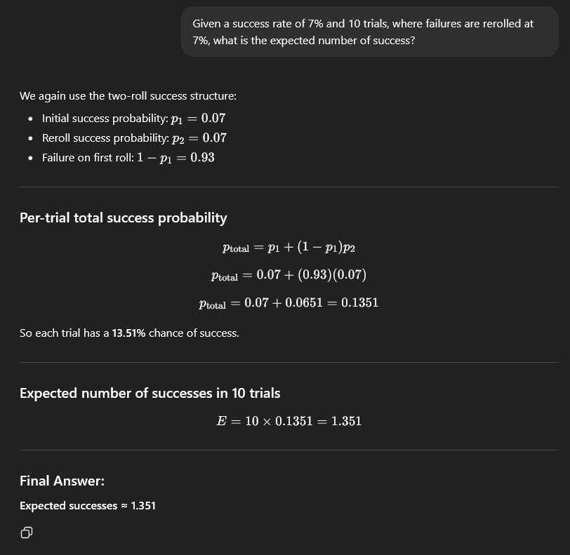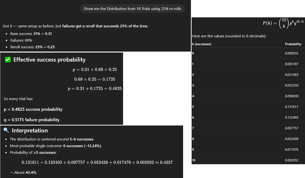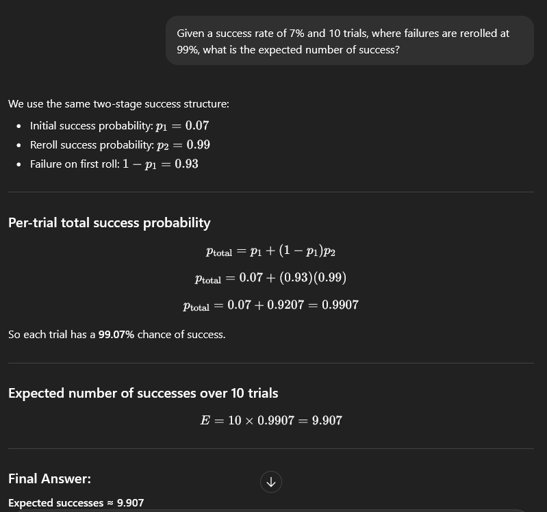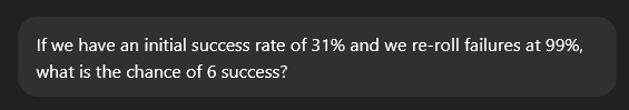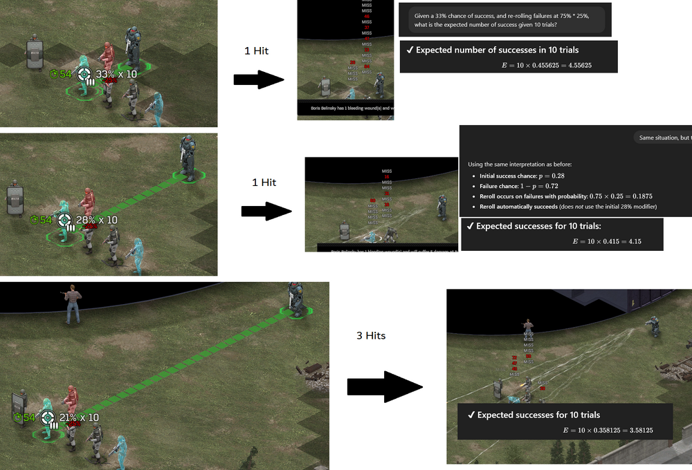 I tried 100.0 setting, it stopped any tests vs aliens. That was the main reason I didn't use it. I can try 100.0 vs soldiers, but I think my next batch will be on 0.0 based on recent findings. I already ruled this out. The 'Missed Shot Hit % is rolled using the actual Shot Hit %', which I believe is a custom function over riding the math? So then I tried killing the front soldier and missing that way, which led to the discovery of 'Accurate Misses'. The current line of thought is that, all my 'Testing' is on the map edge for room (with almost no colliders behind the targets, even in the 51 tile shots), and this is the actual cause. You have to miss and hit a non-target behind the target. This is all aligning very reasonable with my experiences so far. There are some times where I was sure I was going to lose several soldiers to burst fire, but they all missed. This, ironically, would make the shield very strong, as aliens will artificially miss it unless it is off by itself. I was also wondering if the Burst Fire Overkill is related to 'delta t' / tickrate. I have a fairly powerful computer running at high refresh rates usually. I might try forcing 60fps or something later as well.
