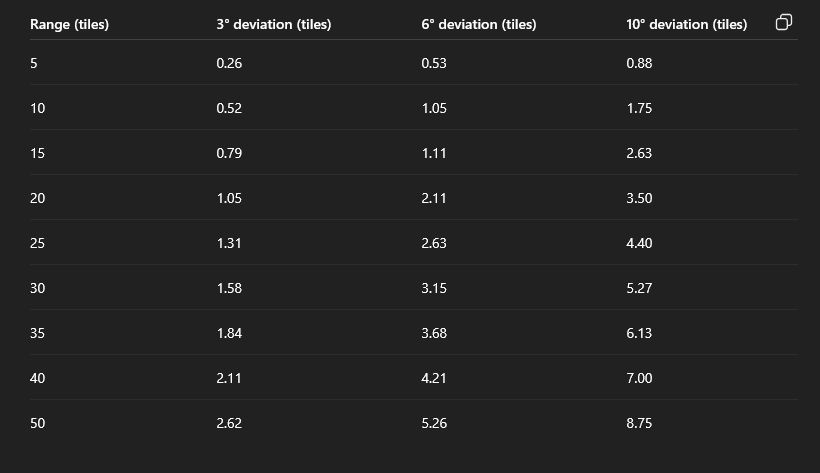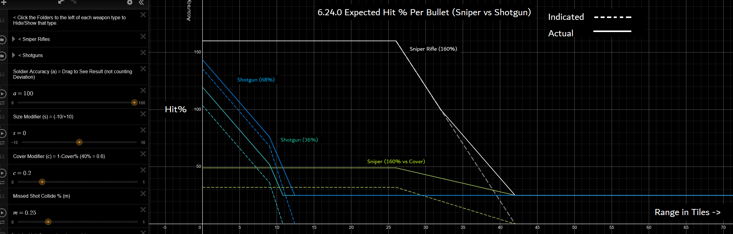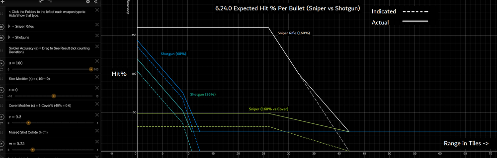 Not a problem, take your time. FYI in 6.24.0 it is still the same, but the deviation change helps. Getting close still unfairly prioritizes cover under 100% 'Modified Combined Accuracy', and under 50% it Misses start having a large factor (but the deviation will help this): Main consequence is that weapons with modifiers under 100% are better at range than up close, since they will hit cover up close and miss more at range. Play with this, should be accurate to 6.24.0: https://www.desmos.com/calculator/nlvvpyjcr9