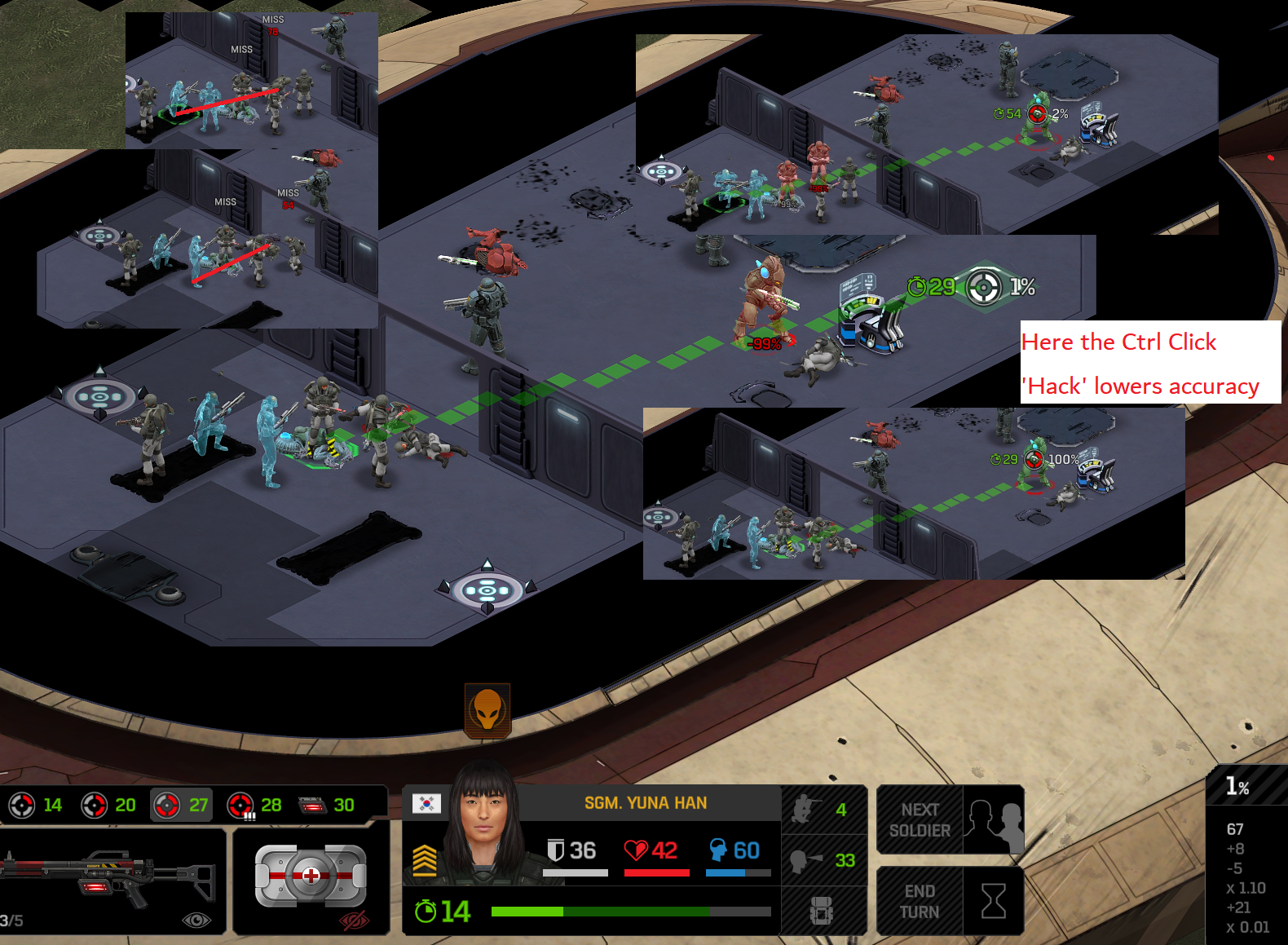 Even damage falloff is 'bugged' and is based on target and not location, because of attempts to 'counter' the 'hack': (I miss-understood the damage randomness being float vs int). These guys getting suppressed, and ducking works like a laser destroying cover, and the result = dead target. The ducked guys are 20% instead of 99% now: Lets check armor damage falloff: Solider inside Max Range = 2 Hits = 16 Broken = ok Soldier outside Max Range = 2 hits = 10 Broken = ok So already, Armor Damage Falloff and Damage Falloff work differently, and we also established that Terrain Damage also works differently. Crouching and Un-crouching has a measured, proven, tested, verifiable effect on missed Grenades, and Missed Shots. (Regardless of my setting) The game will let me take 0% shots that will kill my soldiers, accidentally or not, but it will not let me do the same against enemies, because you think its a hack and not a bug I specifically avoided mentioning Ctrl Click, because I knew this is exactly where this would lead once I encountered the 'You cant take 0% shots system'. This is a system I don't even use, but I know how it works, and thus I never grenade myself.