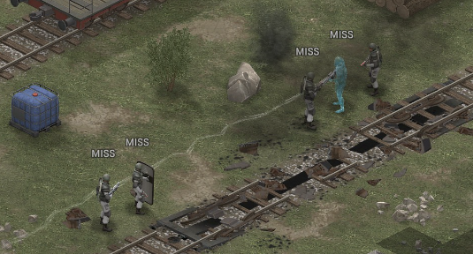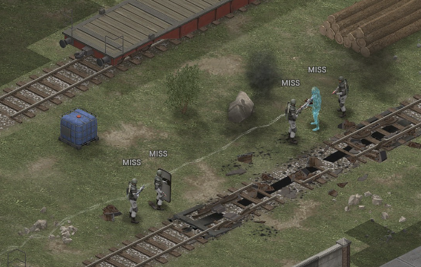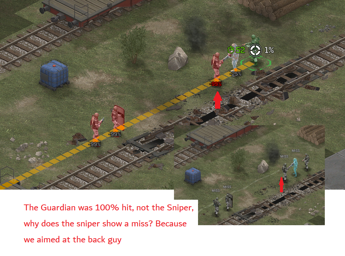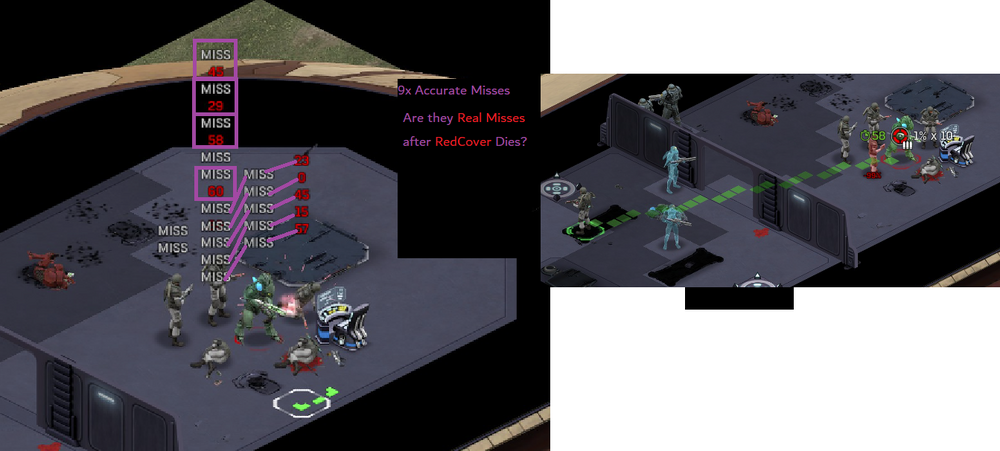 I took these shots about 40-100+ times i think so far? (400-1000 rolls) At 100% it wont let me take the shot due to the 'AntiHack/0% system', so I use 99. I will try 99.99. I cannot tell between deaths and non-death misses. I cannot get a non-burst shot that low other than pistols, and I only have laser pistols, which stop at 32.5%. So I have to use Smoke (which works 'properly') or Range, which exacerbates deviation unless I grind out a 100 accuracy soldier. (I have a 91 acc soldier I think? so 91+8 is almost there, but all these guys have armor on). So to test means I have to run another mission and all my saves are right before a story mission I have not played yet. Attempting to make this 'situation', is where I realized with the help of the 6.24.0 change, that its related to "Soldier" vs "Rock": [ALL SHOTS are taken AT Soldiers my mouse just moved because of key-binds] The result is the people with rocks and trees behind them die: So lets try to confirm that: Now I already KNOW that a 30-50% shot will prioritize cover, so I know the front guy will die, and the target will live (5x Accurate Miss, 1x Miss that hits, 1x Deviated Miss Hit Sniper) I think 1 hit the trees, Its hard to tell sometimes, and one hit the rock at least: If we remove the cover, the shield will get incinerated: 186 Damage, 2 Misses. Inconclusive. vs We can test this many ways: Did they die and it chose a new target? Did they deviate and die? Why is death related to proximity to rock?: Conclusive proof of "Cover Bias": Every single thing other than what we aim at is pulverized. Another undeniable example of Accurate Misses Another example of cover bias (its a bad one, but the train lived several shots): Deviation and Number of Proximal 'Rocks/Walls/Etc' seem to play a factor: Save: All of this post was on this save:user_5cent-26.json Smoke I forgot to get pictures of the smoke interaction, but this is it: