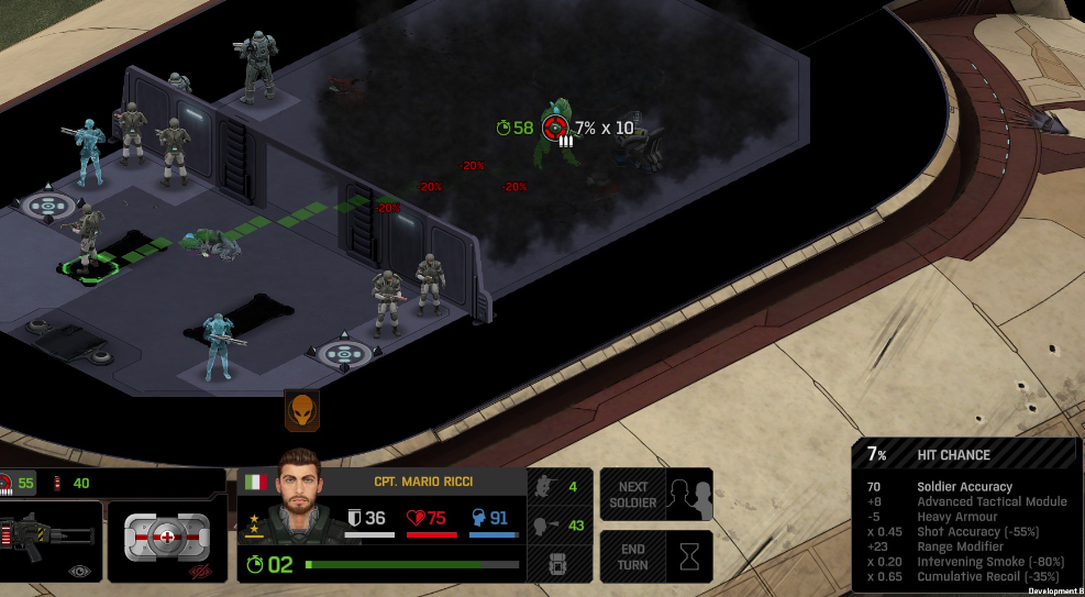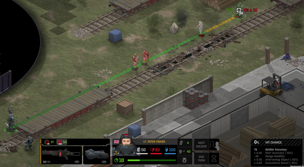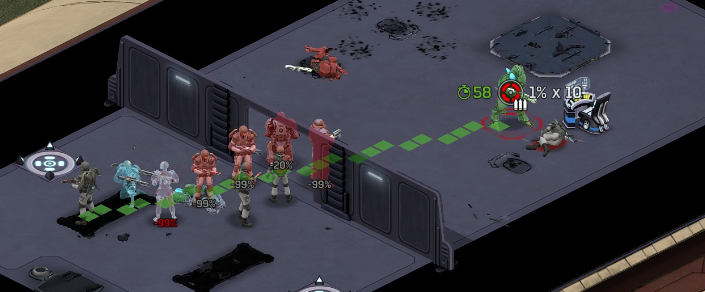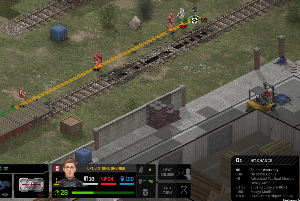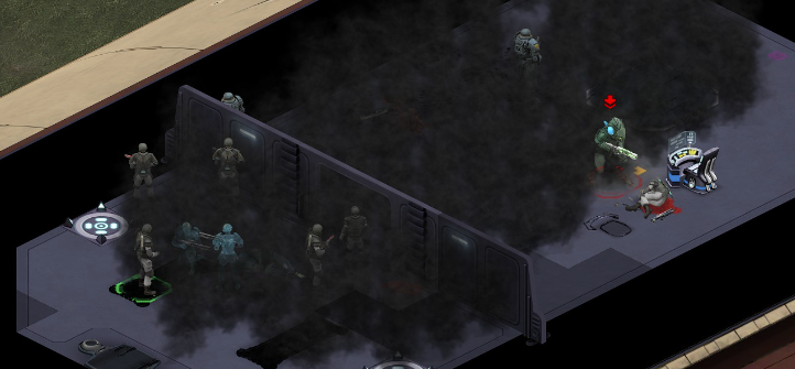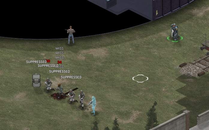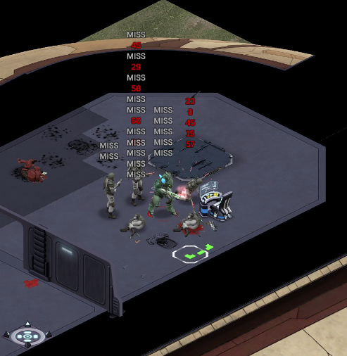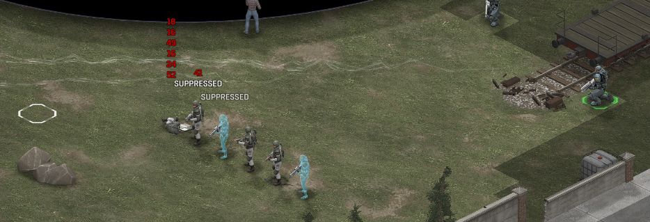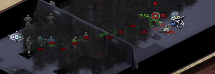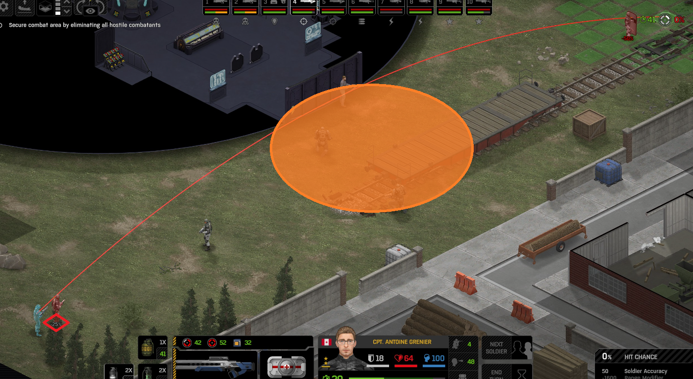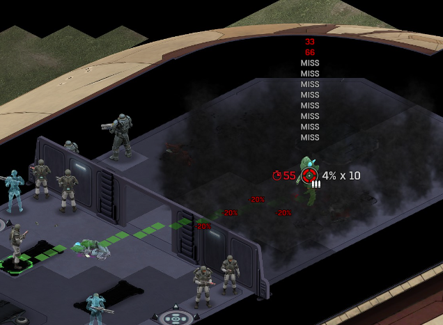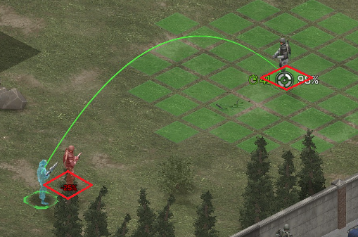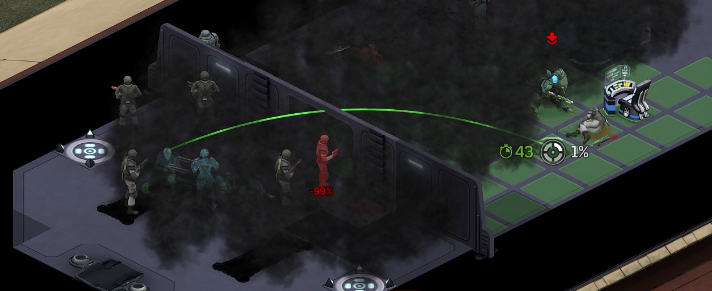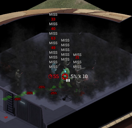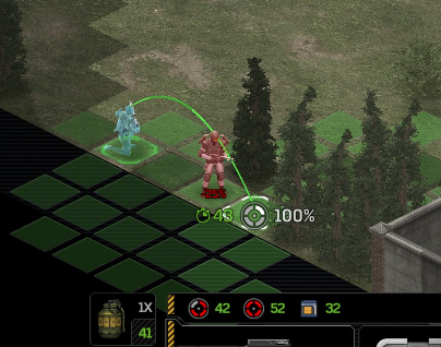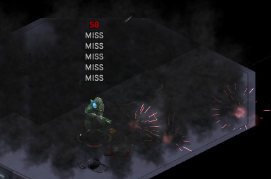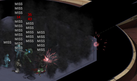 Its not working fine, you are saying this should have -40% damage, and I have shown that it applies to all hits. The Laser does 23/34.5/46/92 damage, with 8 armor destruction. We are shooting vs 36 armor. All shots did 0 damage. The first target took 16 armor damage, meaning 2x8, meaning no Falloff, and No Damage Randomization. 46-36=10dmg, not 0dmg. So HP Damage and Armor Damage use different falloff. I suspected this, but only confirmed it with those screenshots. The Solder at the back who took 10 armor damage, had 40% Reduction. If each shot applies armor damage before the next one, it makes this even more bugged. (Picture of it being -40): I am not blaming the dev team, at all. I have no idea where you got that idea from. I am trying to explain that a bug with the "StoppingChanceComponent" variable and its derivatives is influencing the entire game: ALL shots roll to hit TWICE, not once. Missed Shots have 25% Accuracy Missed Shots roll cover sequentially, Accurate Shots roll cover once. Accurate shots that punch through cover, will be specially modified to hit the 'target' with the 'hit%' and not the 'miss%'. [Attempt to counter the bug/hack] Accurate shots that kill the target will not deviate as missed shots. Missed shots deviate via 'Combined Accuracy' in terms of Tiles (not fully confirmed). Smoke is the only thing that modifies 'Missed Shot Hit %' (other than modifying it directly via crouch, etc) Due to all of this, the Shot Indicator is hilariously wrong most of the time, and weapon balance is all over the place. This setting is one of the single biggest balance variables in the game right now. It is the sole reason why most weapons need range bonus. It is the only thing that causes soldier death for me. This is a 0% shot that is actually a 0% shot, but I cannot take the shot to 'prove it' because of the 'system': You can make it into a non-0 shot by getting closer, but this 'abuses the bug' to a limited degree (this is a bad shot because I did not have enough TU for a 10x): If missed shots have 0% hit, this shot can expect 1 hit if we shot a 10 round burst at it: If 'missed shots hit 25% of the time', this is actually 3.3 hits: Now its not quite 3.3, there is some smoke and other factors we can get to. So lets look at a 7% shot into 80% smoke: How many shots will hit (I have 99% hit on missed shots on for this shot)? If smoke worked like the other systems, it would hit 9/10 shots: But smoke is the only thing that works right: So when does a missed shot get better than a normal shot? Unless the shot indicator says 20% or higher, missing is better before cover. So with cover, it gets messy. An Accurate Shot, that Misses due to Cover, will hit that Cover. This is why I only throw 100% grenades. Grenades effectively ONLY miss due to cover (not really, but in practice this is the case, we will get to it). These Shots have been programmed to not use the 25% miss-hit chance, thus they will usually hit cover behind the target. Missed Shots are not subjected to this arbitration, but have to roll through 'each cover', not just the 'highest cover'. This is why Heavy Weapons other than the Laser Machine gun are bad. Cover absorbs their shots like mad, the laser does this too, but it destroyed the offending cover, in both Accurate Misses and Misses. You probably think I am crazy talking about 'accurate misses', but they exist. These are accurate misses killing the cover in-front of and behind an enemy in smoke, but missing the enemy every time. Every target here has the same 25% hit chance: We can duck the front soldiers to make them non longer valid targets for "Accurate Misses" and only valid targets for "Misses", thus they will live and the wall will get shot instead: Now this all gets really messy really quickly. This value determines so much, and it is not even behaving consistently enough for me to test it properly. This is a picture, where my setting is at 50%, but this solider has 25%, he did not move or duck or anything. I even ended the turn and it stayed the same: So ignoring why this value is so inconsistent even in controlled tests, lets look at grenades. This will always land on the square, which is expected: This one is 50% behind the solider, 50% on the solider. I think many people would assume this grenade can land somewhere other than the 2 red squares, they would be wrong. This grenade will only land in the red square, or the orange area: Basically, there are no 'missed' grenades. They will always be "accurate misses", and thus will ALWAYS hit the red cover (which is not always red). "missed" grenades will miss due to deviation, but do not deviate far enough to cause FF issues. So lets talk about Deviation. It seems to be directly related to 'Combined Accuracy'. This solider has 76 accuracy, making my estimate ~2 tiles deviation: If you increase accuracy, you lower 'Missed Shots', and thus you lower your ability to suppress since 'Accurate Misses dont deviate': If you get closer, you increase accuracy due to 'Range Bonus', again lowering missed shots, and lowering suppression: Since we are using 'Accurate Shots', they will prioritize any cover instead of the target: This is why this image exists: (I just miss-understood the root cause) This is why the gauss machine guns feel off (not bad), it shoots AT COVER, not at enemies the closer you get. Taking all this into account, this shot has a very high chance of killing your own soldier (if the wall is breakable, I don't even really fire burst inside UFOs). If you shoot enough burst to break all the cover, in this case 5 tiles of cover, but we only hit each one 40% of the time, so 10 bullets might do it. Please take the time to read this thread in its entirety once more. I have explained everything from multiple angles.
