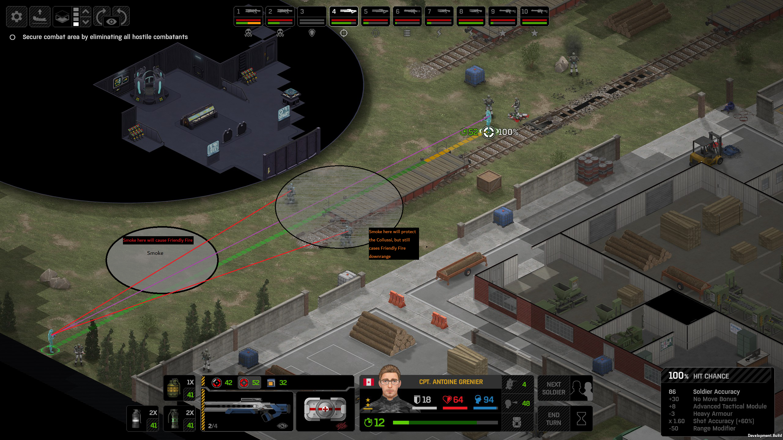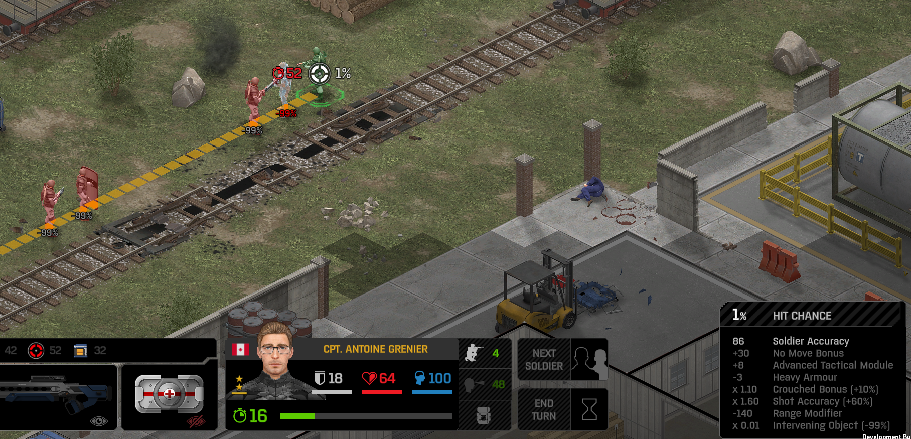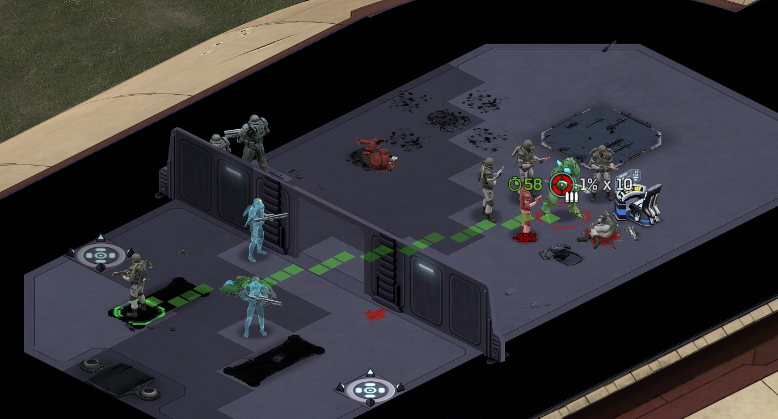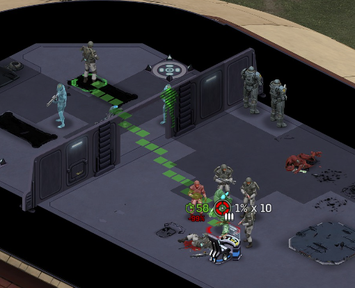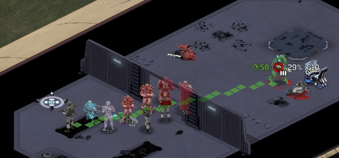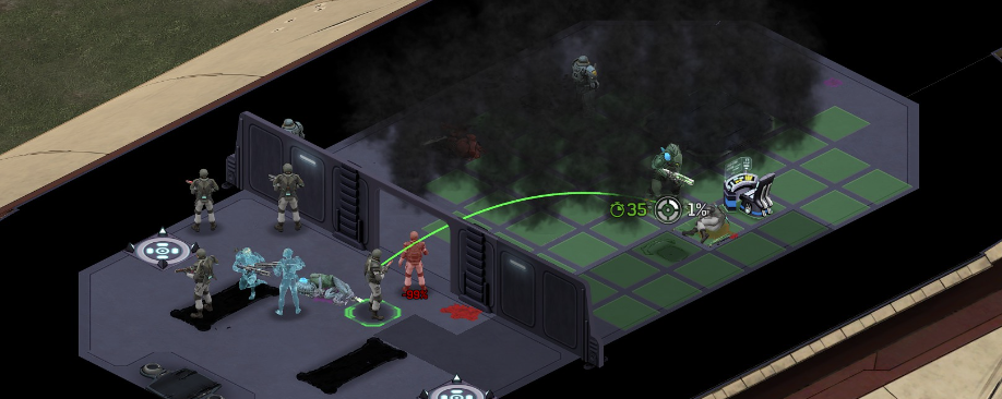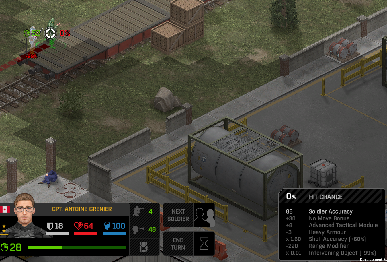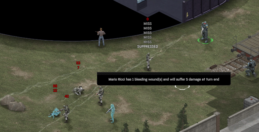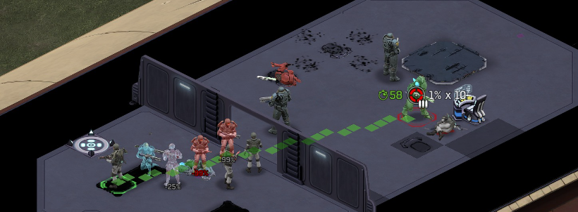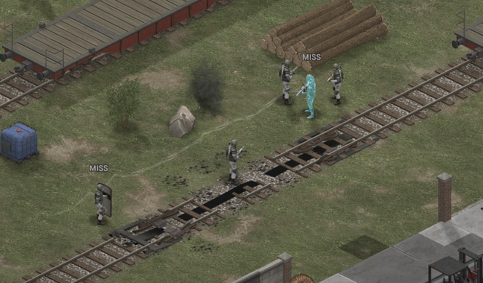 Its not working fine, you are saying this should have -40% damage, and I have shown that it applies to all hits. The Laser does 23/34.5/46/92 damage, with 8 armor destruction. We are shooting vs 36 armor. All shots did 0 damage. The first target took 16 armor damage, meaning 2x8, meaning no Falloff, and No Damage Randomization. 46-36=10dmg, not 0dmg. So HP Damage and Armor Damage use different falloff. I suspected this, but only confirmed it with those screenshots. The Solder at the back who took 10 armor damage, had 40% Reduction. If each shot applies armor damage before the next one, it makes this even more bugged. (Picture of it being -40): I am not blaming the dev team, at all. I have no idea where you got that idea from. I am trying to explain that a bug with the "StoppingChanceComponent" variable and its derivatives is influencing the entire game: ALL shots roll to hit TWICE, not once. Missed Shots have 25% Accuracy Missed Shots roll cover sequentially, Accurate Shots roll cover once. Accurate shots that punch through cover, will be specially modified to hit the 'target' with the 'hit%' and not the 'miss%'. [Attempt to counter the bug/hack] Accurate shots that kill the target will not deviate as missed shots. Missed shots deviate via 'Combined Accuracy' in terms of Tiles (not fully confirmed). Smoke is the only thing that modifies 'Missed Shot Hit %' (other than modifying it directly via crouch, etc) Due to all of this, the Shot Indicator is hilariously wrong most of the time, and weapon balance is all over the place. This setting is one of the single biggest balance variables in the game right now. It is the sole reason why most weapons need range bonus. It is the only thing that causes soldier death for me. This is a 0% shot that is actually a 0% shot, but I cannot take the shot to 'prove it' because of the 'system': You can make it into a non-0 shot by getting closer, but this 'abuses the bug' to a limited degree (this is a bad shot because I did not have enough TU for a 10x): If missed shots have 0% hit, this shot can expect 1 hit if we shot a 10 round burst at it: If 'missed shots hit 25% of the time', this is actually 3.3 hits: Now its not quite 3.3, there is some smoke and other factors we can get to. So lets look at a 7% shot into 80% smoke: How many shots will hit (I have 99% hit on missed shots on for this shot)? If smoke worked like the other systems, it would hit 9/10 shots: But smoke is the only thing that works right: So when does a missed shot get better than a normal shot? Unless the shot indicator says 20% or higher, missing is better before cover. So with cover, it gets messy. An Accurate Shot, that Misses due to Cover, will hit that Cover. This is why I only throw 100% grenades. Grenades effectively ONLY miss due to cover (not really, but in practice this is the case, we will get to it). These Shots have been programmed to not use the 25% miss-hit chance, thus they will usually hit cover behind the target. Missed Shots are not subjected to this arbitration, but have to roll through 'each cover', not just the 'highest cover'. This is why Heavy Weapons other than the Laser Machine gun are bad. Cover absorbs their shots like mad, the laser does this too, but it destroyed the offending cover, in both Accurate Misses and Misses. You probably think I am crazy talking about 'accurate misses', but they exist. These are accurate misses killing the cover in-front of and behind an enemy in smoke, but missing the enemy every time. Every target here has the same 25% hit chance: We can duck the front soldiers to make them non longer valid targets for "Accurate Misses" and only valid targets for "Misses", thus they will live and the wall will get shot instead: Now this all gets really messy really quickly. This value determines so much, and it is not even behaving consistently enough for me to test it properly. This is a picture, where my setting is at 50%, but this solider has 25%, he did not move or duck or anything. I even ended the turn and it stayed the same: So ignoring why this value is so inconsistent even in controlled tests, lets look at grenades. This will always land on the square, which is expected: This one is 50% behind the solider, 50% on the solider. I think many people would assume this grenade can land somewhere other than the 2 red squares, they would be wrong. This grenade will only land in the red square, or the orange area: Basically, there are no 'missed' grenades. They will always be "accurate misses", and thus will ALWAYS hit the red cover (which is not always red). "missed" grenades will miss due to deviation, but do not deviate far enough to cause FF issues. So lets talk about Deviation. It seems to be directly related to 'Combined Accuracy'. This solider has 76 accuracy, making my estimate ~2 tiles deviation: If you increase accuracy, you lower 'Missed Shots', and thus you lower your ability to suppress since 'Accurate Misses dont deviate': If you get closer, you increase accuracy due to 'Range Bonus', again lowering missed shots, and lowering suppression: Since we are using 'Accurate Shots', they will prioritize any cover instead of the target: This is why this image exists: (I just miss-understood the root cause) This is why the gauss machine guns feel off (not bad), it shoots AT COVER, not at enemies the closer you get. Taking all this into account, this shot has a very high chance of killing your own soldier (if the wall is breakable, I don't even really fire burst inside UFOs). If you shoot enough burst to break all the cover, in this case 5 tiles of cover, but we only hit each one 40% of the time, so 10 bullets might do it. Please take the time to read this thread in its entirety once more. I have explained everything from multiple angles.