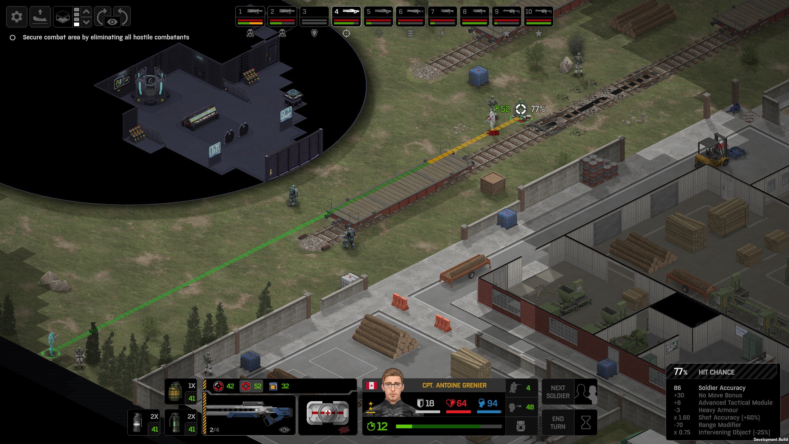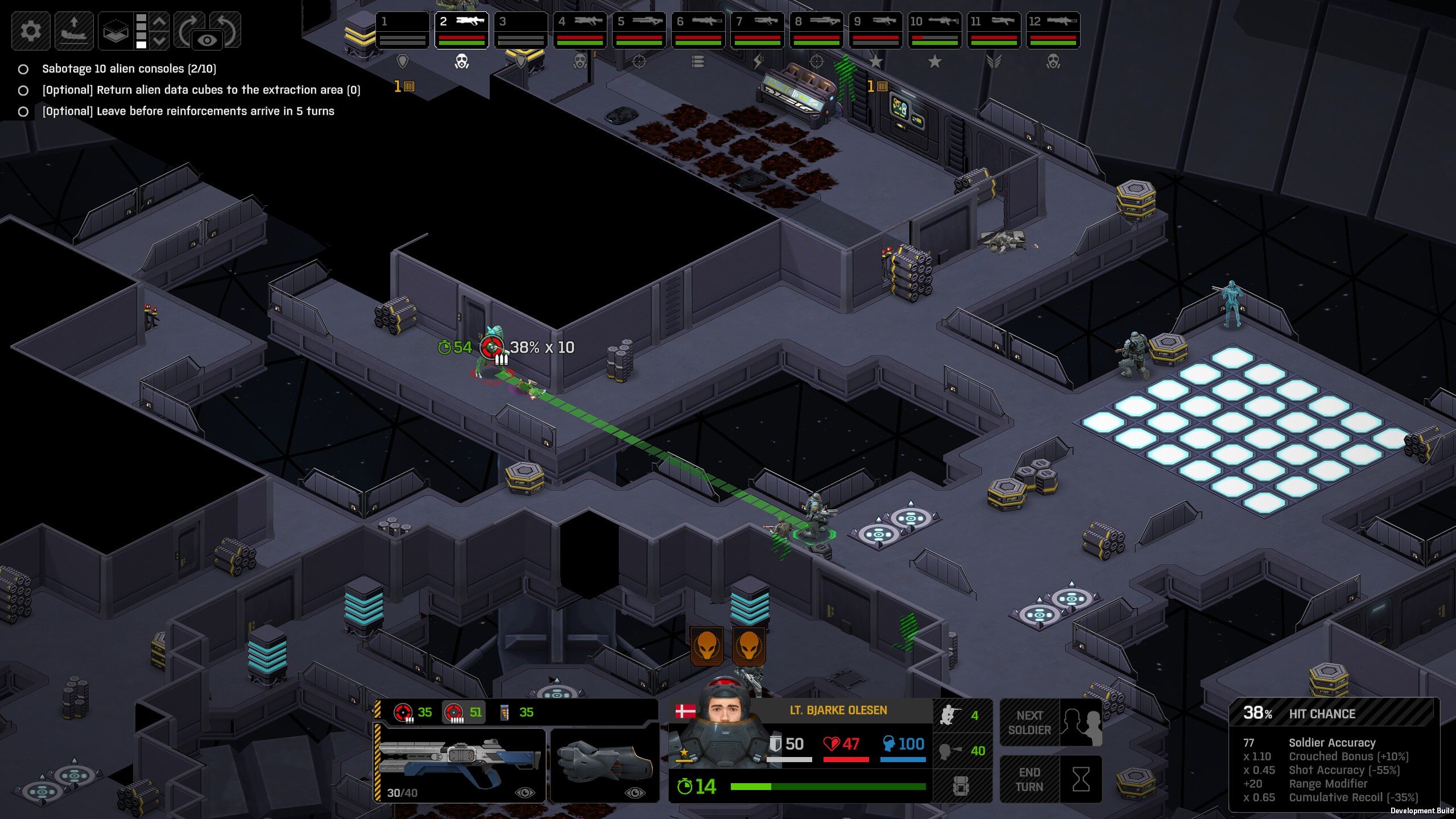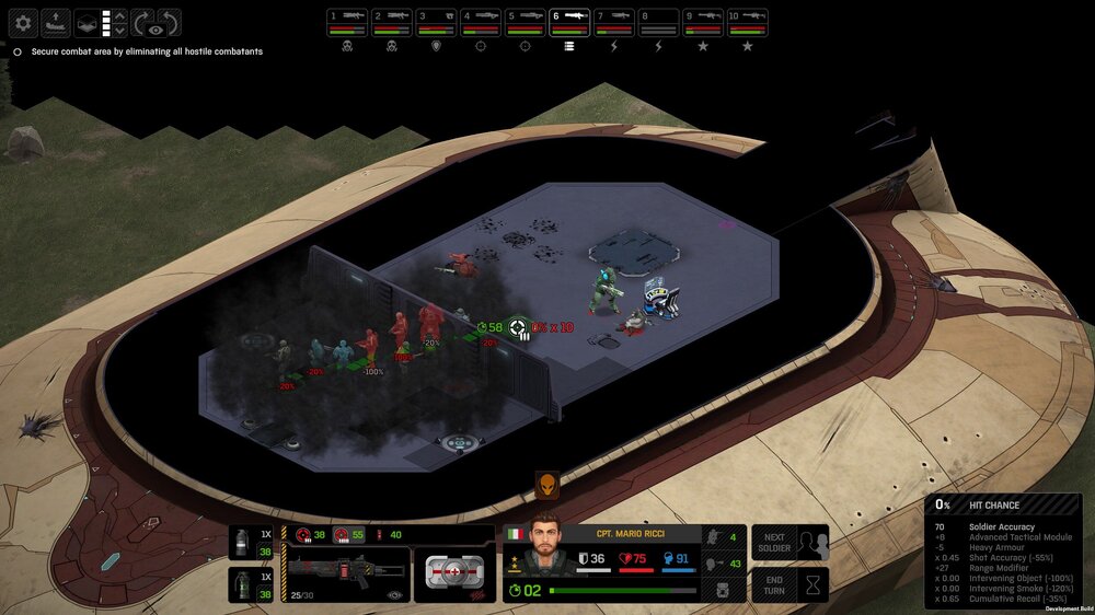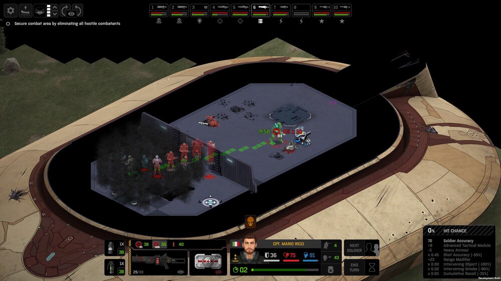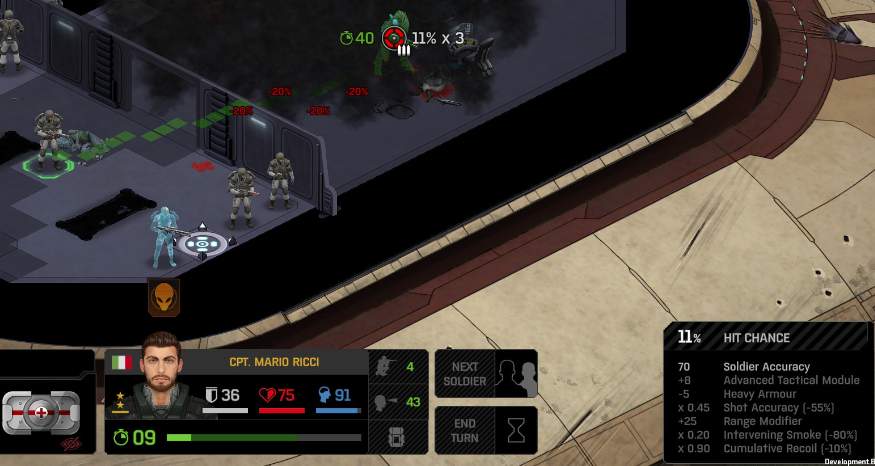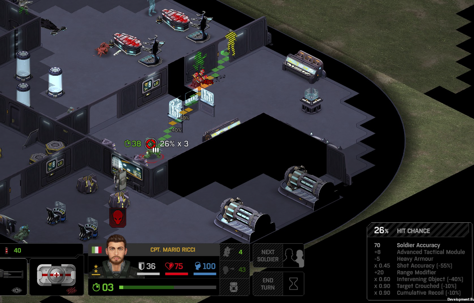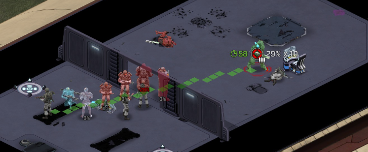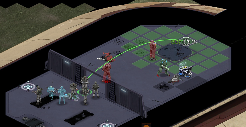 Its not working fine, you are saying this should have -40% damage, and I have shown that it applies to all hits. The Laser does 23/34.5/46/92 damage, with 8 armor destruction. We are shooting vs 36 armor. All shots did 0 damage. The first target took 16 armor damage, meaning 2x8, meaning no Falloff, and No Damage Randomization. 46-36=10dmg, not 0dmg. So HP Damage and Armor Damage use different falloff. I suspected this, but only confirmed it with those screenshots. The Solder at the back who took 10 armor damage, had 40% Reduction. If each shot applies armor damage before the next one, it makes this even more bugged. (Picture of it being -40): I am not blaming the dev team, at all. I have no idea where you got that idea from. I am trying to explain that a bug with the "StoppingChanceComponent" variable and its derivatives is influencing the entire game: ALL shots roll to hit TWICE, not once. Missed Shots have 25% Accuracy Missed Shots roll cover sequentially, Accurate Shots roll cover once. Accurate shots that punch through cover, will be specially modified to hit the 'target' with the 'hit%' and not the 'miss%'. [Attempt to counter the bug/hack] Accurate shots that kill the target will not deviate as missed shots. Missed shots deviate via 'Combined Accuracy' in terms of Tiles (not fully confirmed). Smoke is the only thing that modifies 'Missed Shot Hit %' (other than modifying it directly via crouch, etc) Due to all of this, the Shot Indicator is hilariously wrong most of the time, and weapon balance is all over the place. This setting is one of the single biggest balance variables in the game right now. It is the sole reason why most weapons need range bonus. It is the only thing that causes soldier death for me. This is a 0% shot that is actually a 0% shot, but I cannot take the shot to 'prove it' because of the 'system': You can make it into a non-0 shot by getting closer, but this 'abuses the bug' to a limited degree (this is a bad shot because I did not have enough TU for a 10x): If missed shots have 0% hit, this shot can expect 1 hit if we shot a 10 round burst at it: If 'missed shots hit 25% of the time', this is actually 3.3 hits: Now its not quite 3.3, there is some smoke and other factors we can get to. So lets look at a 7% shot into 80% smoke: How many shots will hit (I have 99% hit on missed shots on for this shot)? If smoke worked like the other systems, it would hit 9/10 shots: But smoke is the only thing that works right: So when does a missed shot get better than a normal shot? Unless the shot indicator says 20% or higher, missing is better before cover. So with cover, it gets messy. An Accurate Shot, that Misses due to Cover, will hit that Cover. This is why I only throw 100% grenades. Grenades effectively ONLY miss due to cover (not really, but in practice this is the case, we will get to it). These Shots have been programmed to not use the 25% miss-hit chance, thus they will usually hit cover behind the target. Missed Shots are not subjected to this arbitration, but have to roll through 'each cover', not just the 'highest cover'. This is why Heavy Weapons other than the Laser Machine gun are bad. Cover absorbs their shots like mad, the laser does this too, but it destroyed the offending cover, in both Accurate Misses and Misses. You probably think I am crazy talking about 'accurate misses', but they exist. These are accurate misses killing the cover in-front of and behind an enemy in smoke, but missing the enemy every time. Every target here has the same 25% hit chance: We can duck the front soldiers to make them non longer valid targets for "Accurate Misses" and only valid targets for "Misses", thus they will live and the wall will get shot instead: Now this all gets really messy really quickly. This value determines so much, and it is not even behaving consistently enough for me to test it properly. This is a picture, where my setting is at 50%, but this solider has 25%, he did not move or duck or anything. I even ended the turn and it stayed the same: So ignoring why this value is so inconsistent even in controlled tests, lets look at grenades. This will always land on the square, which is expected: This one is 50% behind the solider, 50% on the solider. I think many people would assume this grenade can land somewhere other than the 2 red squares, they would be wrong. This grenade will only land in the red square, or the orange area: Basically, there are no 'missed' grenades. They will always be "accurate misses", and thus will ALWAYS hit the red cover (which is not always red). "missed" grenades will miss due to deviation, but do not deviate far enough to cause FF issues. So lets talk about Deviation. It seems to be directly related to 'Combined Accuracy'. This solider has 76 accuracy, making my estimate ~2 tiles deviation: If you increase accuracy, you lower 'Missed Shots', and thus you lower your ability to suppress since 'Accurate Misses dont deviate': If you get closer, you increase accuracy due to 'Range Bonus', again lowering missed shots, and lowering suppression: Since we are using 'Accurate Shots', they will prioritize any cover instead of the target: This is why this image exists: (I just miss-understood the root cause) This is why the gauss machine guns feel off (not bad), it shoots AT COVER, not at enemies the closer you get. Taking all this into account, this shot has a very high chance of killing your own soldier (if the wall is breakable, I don't even really fire burst inside UFOs). If you shoot enough burst to break all the cover, in this case 5 tiles of cover, but we only hit each one 40% of the time, so 10 bullets might do it. Please take the time to read this thread in its entirety once more. I have explained everything from multiple angles.