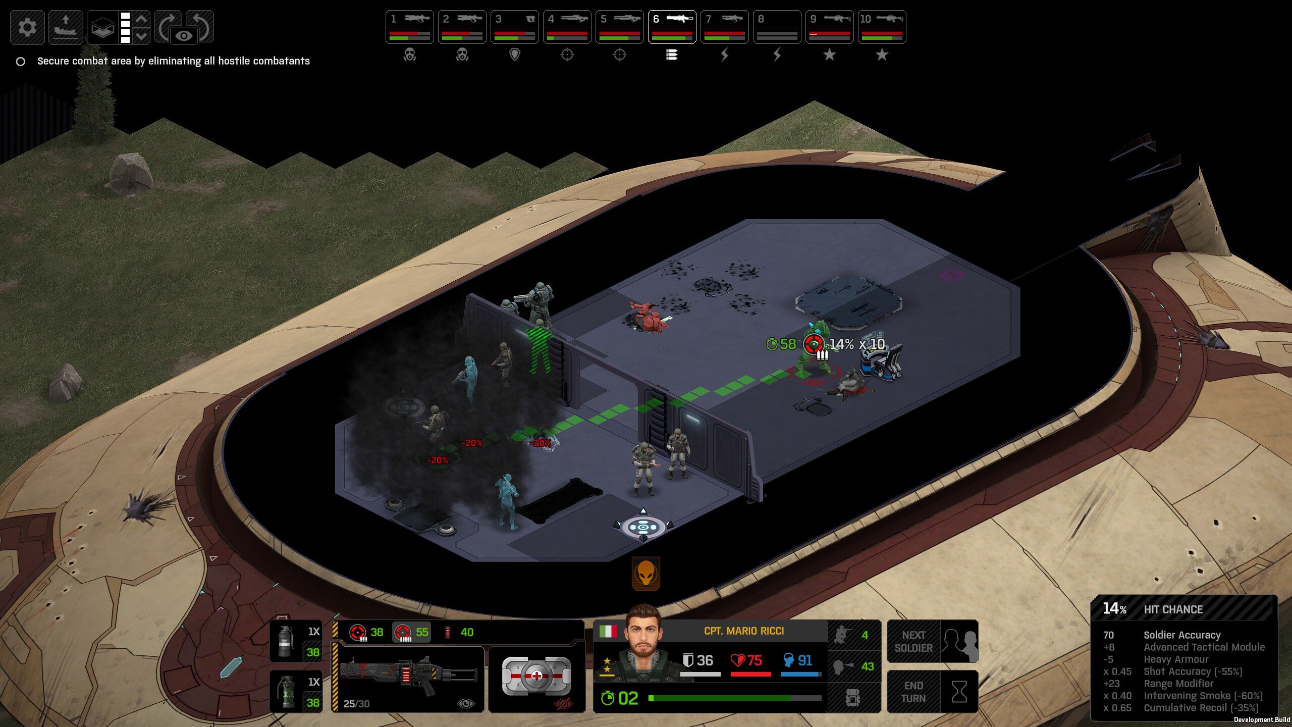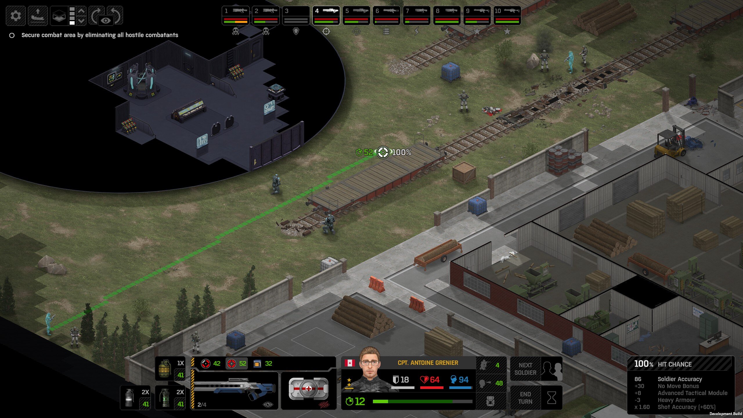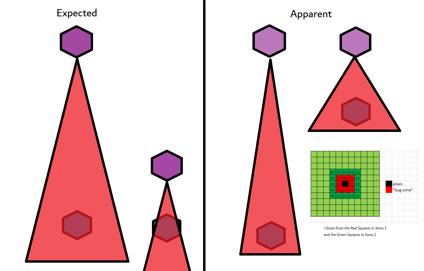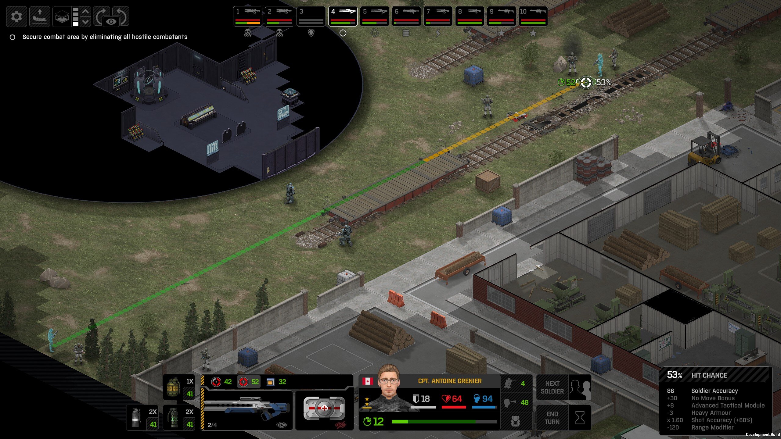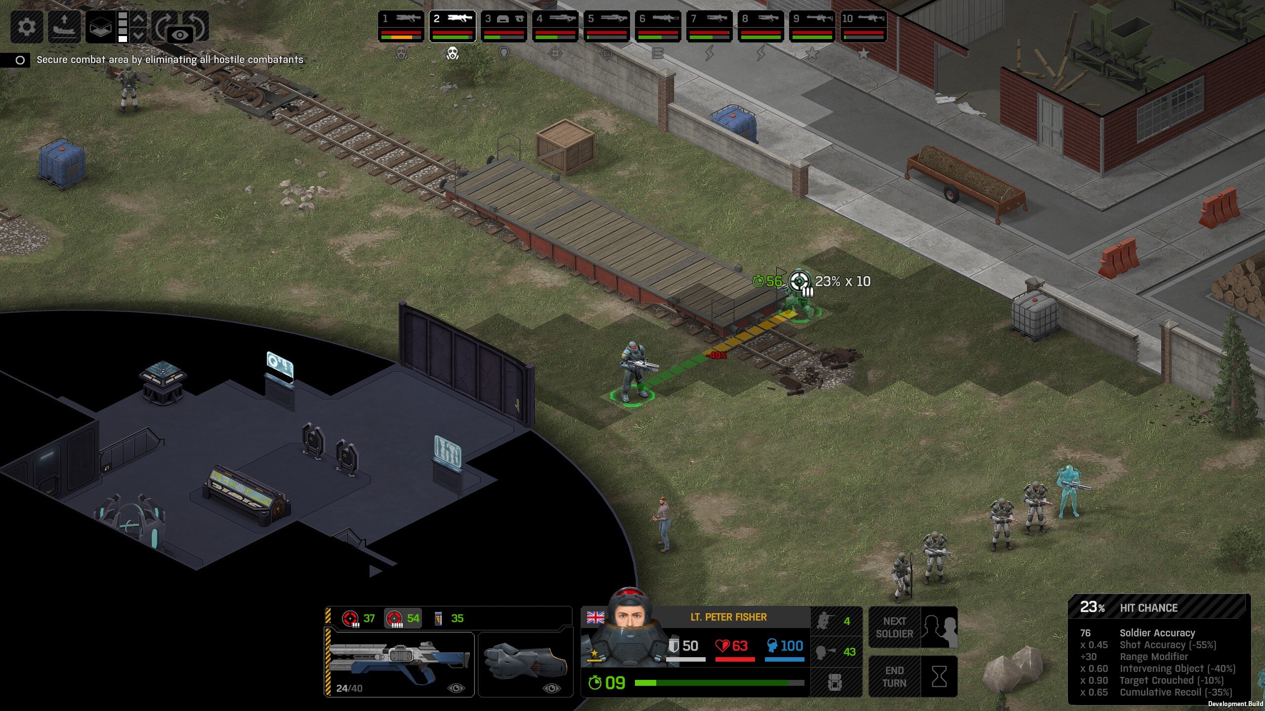 Its not working fine, you are saying this should have -40% damage, and I have shown that it applies to all hits. The Laser does 23/34.5/46/92 damage, with 8 armor destruction. We are shooting vs 36 armor. All shots did 0 damage. The first target took 16 armor damage, meaning 2x8, meaning no Falloff, and No Damage Randomization. 46-36=10dmg, not 0dmg. So HP Damage and Armor Damage use different falloff. I suspected this, but only confirmed it with those screenshots. The Solder at the back who took 10 armor damage, had 40% Reduction. If each shot applies armor damage before the next one, it makes this even more bugged. (Picture of it being -40): I am not blaming the dev team, at all. I have no idea where you got that idea from. I am trying to explain that a bug with the "StoppingChanceComponent" variable and its derivatives is influencing the entire game: ALL shots roll to hit TWICE, not once. Missed Shots have 25% Accuracy Missed Shots roll cover sequentially, Accurate Shots roll cover once. Accurate shots that punch through cover, will be specially modified to hit the 'target' with the 'hit%' and not the 'miss%'. [Attempt to counter the bug/hack] Accurate shots that kill the target will not deviate as missed shots. Missed shots deviate via 'Combined Accuracy' in terms of Tiles (not fully confirmed). Smoke is the only thing that modifies 'Missed Shot Hit %' (other than modifying it directly via crouch, etc) Due to all of this, the Shot Indicator is hilariously wrong most of the time, and weapon balance is all over the place. This setting is one of the single biggest balance variables in the game right now. It is the sole reason why most weapons need range bonus. It is the only thing that causes soldier death for me. This is a 0% shot that is actually a 0% shot, but I cannot take the shot to 'prove it' because of the 'system': You can make it into a non-0 shot by getting closer, but this 'abuses the bug' to a limited degree (this is a bad shot because I did not have enough TU for a 10x): If missed shots have 0% hit, this shot can expect 1 hit if we shot a 10 round burst at it: If 'missed shots hit 25% of the time', this is actually 3.3 hits: Now its not quite 3.3, there is some smoke and other factors we can get to. So lets look at a 7% shot into 80% smoke: How many shots will hit (I have 99% hit on missed shots on for this shot)? If smoke worked like the other systems, it would hit 9/10 shots: But smoke is the only thing that works right: So when does a missed shot get better than a normal shot? Unless the shot indicator says 20% or higher, missing is better before cover. So with cover, it gets messy. An Accurate Shot, that Misses due to Cover, will hit that Cover. This is why I only throw 100% grenades. Grenades effectively ONLY miss due to cover (not really, but in practice this is the case, we will get to it). These Shots have been programmed to not use the 25% miss-hit chance, thus they will usually hit cover behind the target. Missed Shots are not subjected to this arbitration, but have to roll through 'each cover', not just the 'highest cover'. This is why Heavy Weapons other than the Laser Machine gun are bad. Cover absorbs their shots like mad, the laser does this too, but it destroyed the offending cover, in both Accurate Misses and Misses. You probably think I am crazy talking about 'accurate misses', but they exist. These are accurate misses killing the cover in-front of and behind an enemy in smoke, but missing the enemy every time. Every target here has the same 25% hit chance: We can duck the front soldiers to make them non longer valid targets for "Accurate Misses" and only valid targets for "Misses", thus they will live and the wall will get shot instead: Now this all gets really messy really quickly. This value determines so much, and it is not even behaving consistently enough for me to test it properly. This is a picture, where my setting is at 50%, but this solider has 25%, he did not move or duck or anything. I even ended the turn and it stayed the same: So ignoring why this value is so inconsistent even in controlled tests, lets look at grenades. This will always land on the square, which is expected: This one is 50% behind the solider, 50% on the solider. I think many people would assume this grenade can land somewhere other than the 2 red squares, they would be wrong. This grenade will only land in the red square, or the orange area: Basically, there are no 'missed' grenades. They will always be "accurate misses", and thus will ALWAYS hit the red cover (which is not always red). "missed" grenades will miss due to deviation, but do not deviate far enough to cause FF issues. So lets talk about Deviation. It seems to be directly related to 'Combined Accuracy'. This solider has 76 accuracy, making my estimate ~2 tiles deviation: If you increase accuracy, you lower 'Missed Shots', and thus you lower your ability to suppress since 'Accurate Misses dont deviate': If you get closer, you increase accuracy due to 'Range Bonus', again lowering missed shots, and lowering suppression: Since we are using 'Accurate Shots', they will prioritize any cover instead of the target: This is why this image exists: (I just miss-understood the root cause) This is why the gauss machine guns feel off (not bad), it shoots AT COVER, not at enemies the closer you get. Taking all this into account, this shot has a very high chance of killing your own soldier (if the wall is breakable, I don't even really fire burst inside UFOs). If you shoot enough burst to break all the cover, in this case 5 tiles of cover, but we only hit each one 40% of the time, so 10 bullets might do it. Please take the time to read this thread in its entirety once more. I have explained everything from multiple angles.