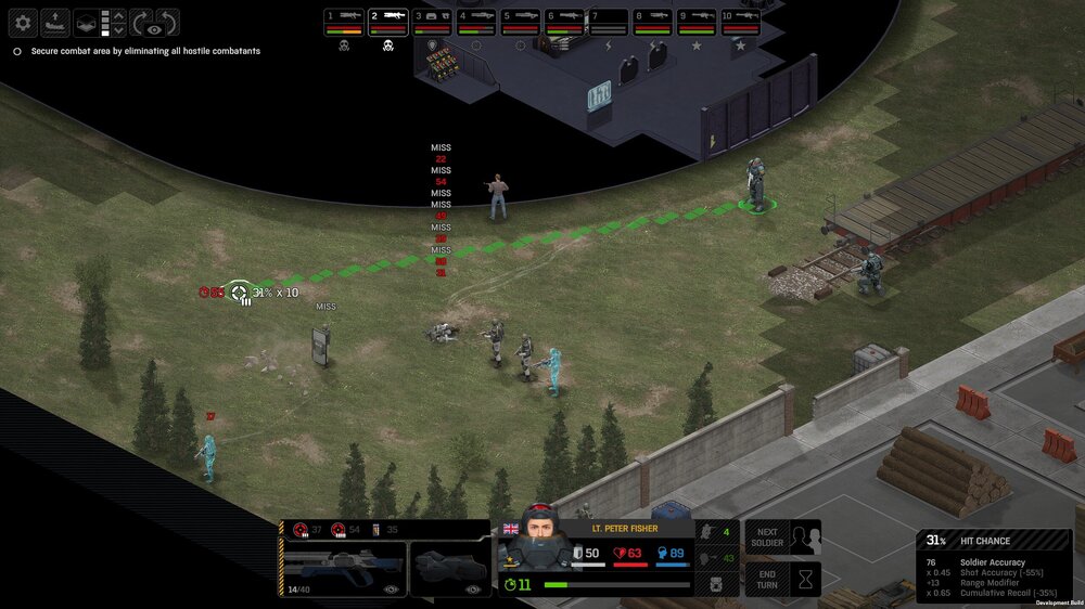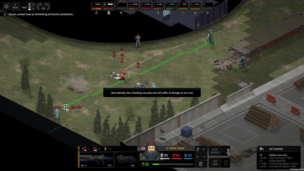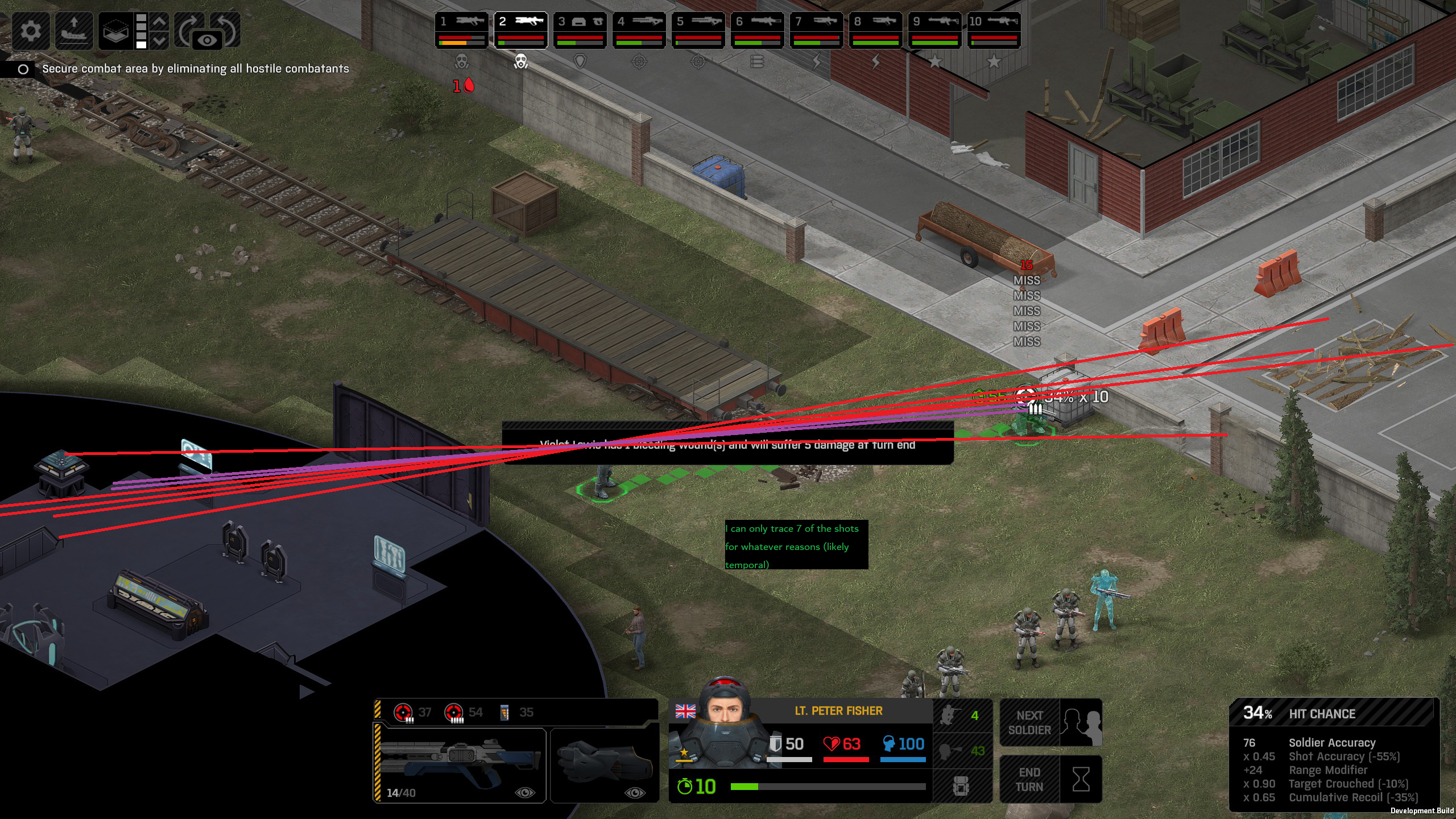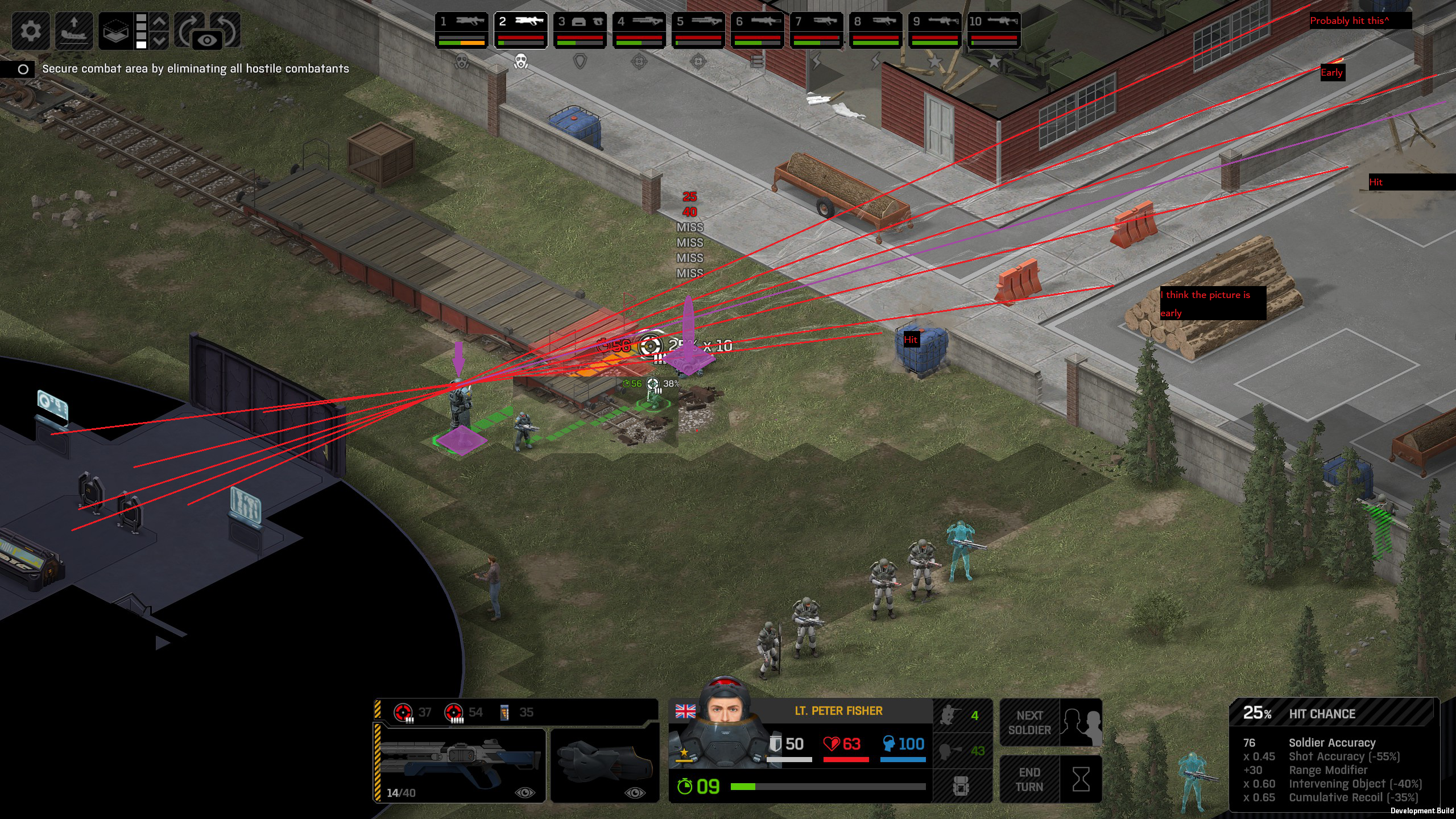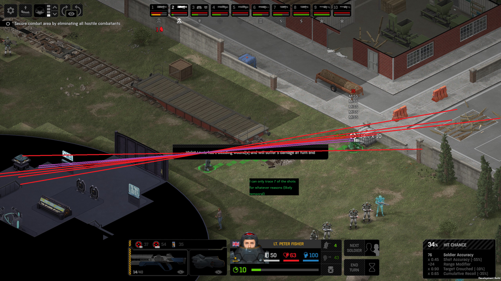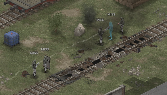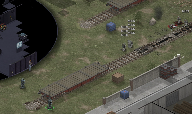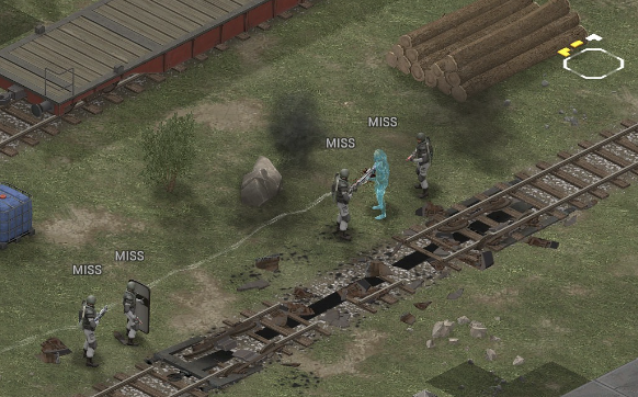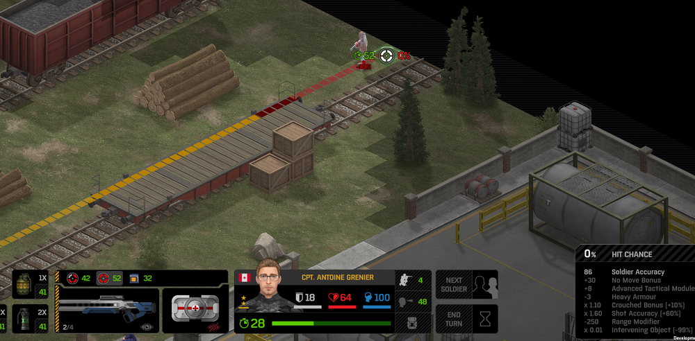Missed shots ignore accuracy. Weather that is a bug, a feature, a hack, an exploit. It is present. It effects grenades, burst weapons, weapon balance, weapon feel, AI behavior, and so much more (soldier survival, meta decisions, etc). You guys have programed at least 2 Systems, and done at least 2 patches, specifically to stop this issue from being 'used' one by good players, and one by bad players. I don't have a 100 Accuracy Soldier yet to test with, this 86 accuracy one can get close at 51 tiles. Its hard to even get the camera to follow the shot: At 48 tiles, same thing: At Exactly -160 (where the 100 accuracy sniper would go from 1% to 0%): The miss on the right was actually a 0 damage hit the game thought was a miss. Now, there was still a deviated shot at this range, so my next assumption is (86 + 8 -3)*1.60 -x= 0, which is 40.56 tiles: There is some deviation here still. So closer. 0 Damage hit again, going through 3x 99% cover. Still some deviation though: Not much though: This is madness: Why does crouching and uncrouching change missed shot accuracy?
