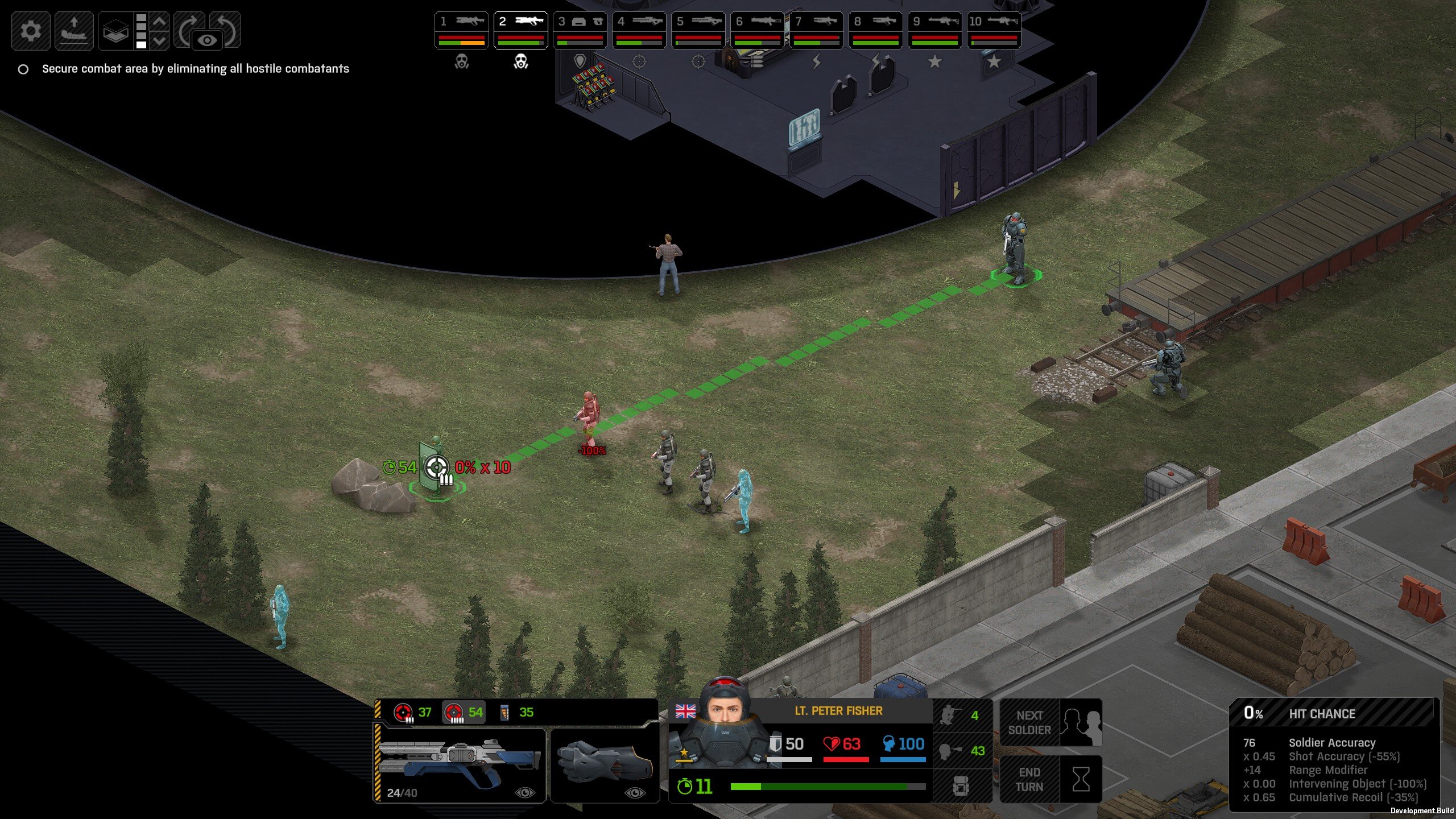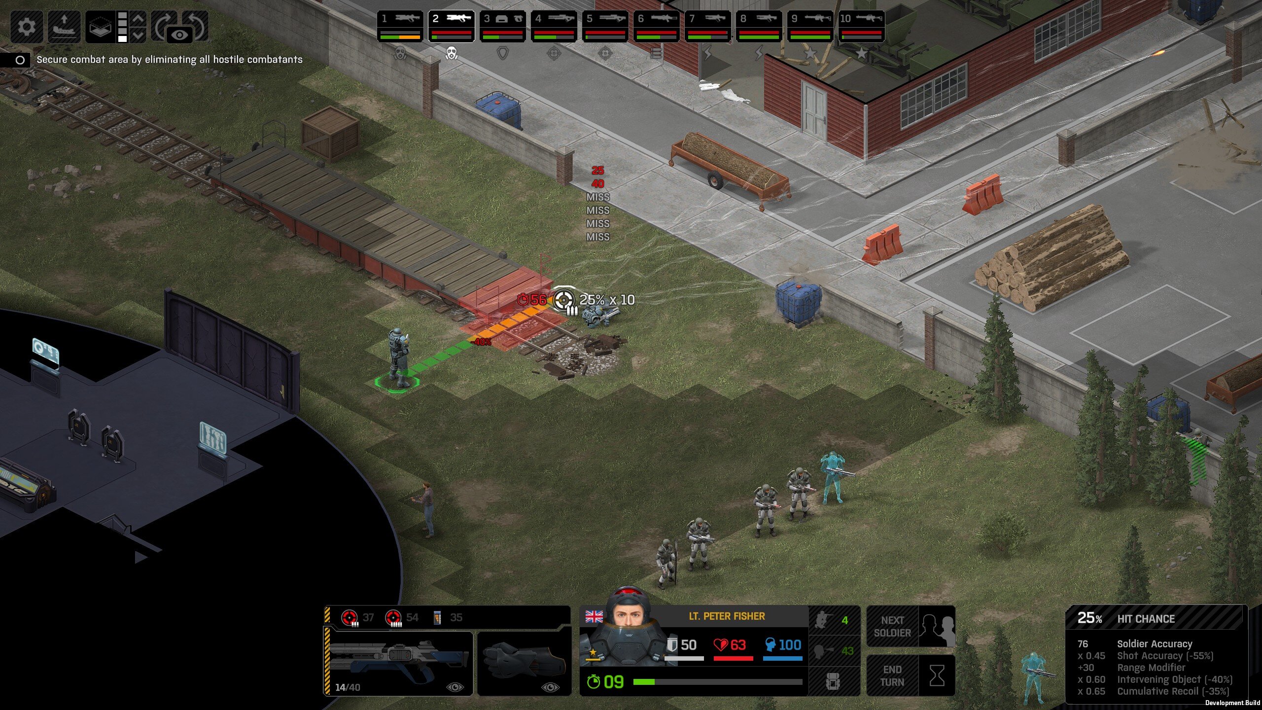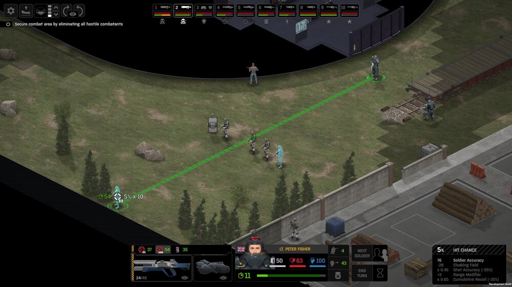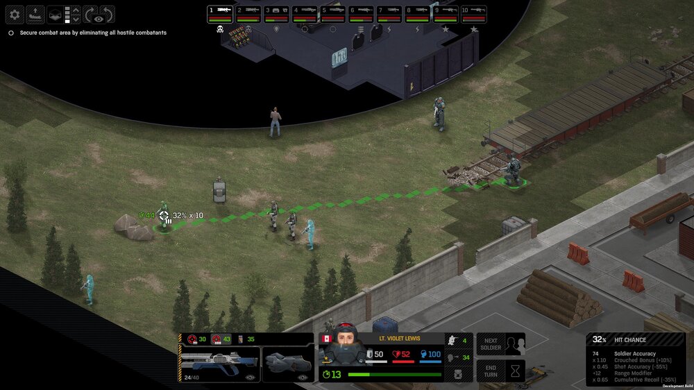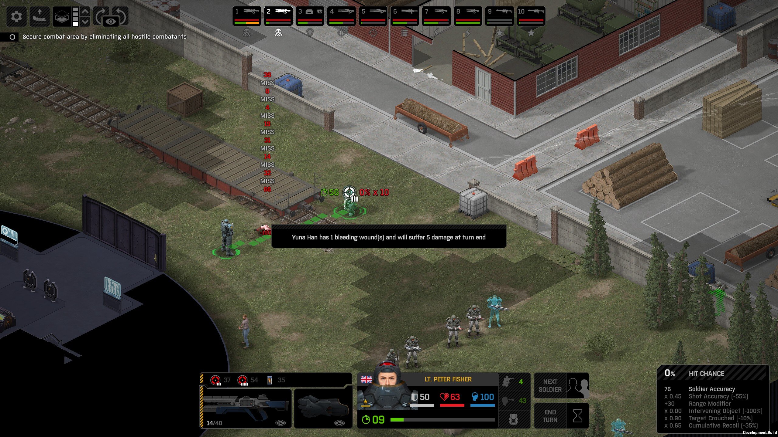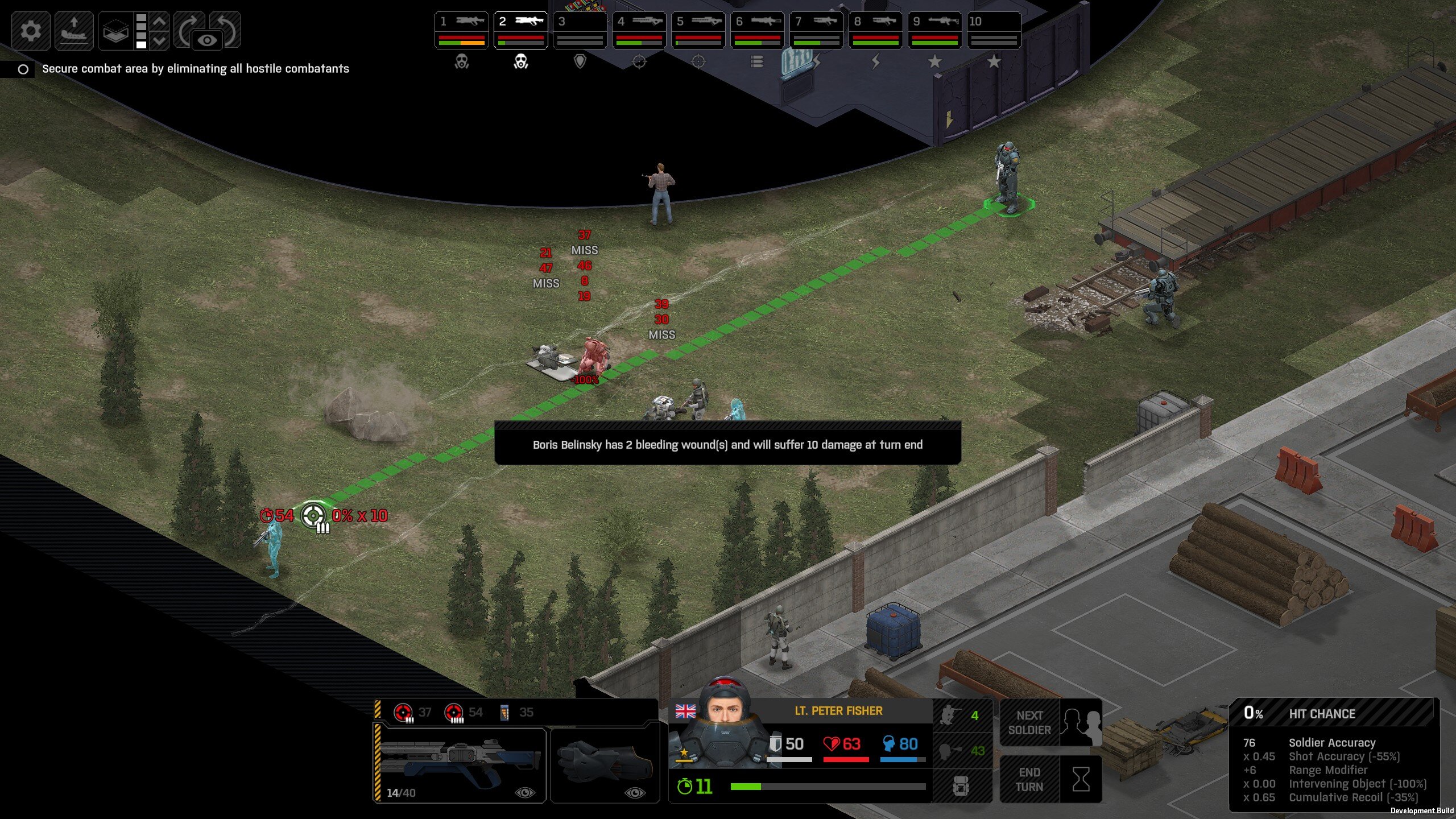 Missed shots ignore accuracy. Weather that is a bug, a feature, a hack, an exploit. It is present. It effects grenades, burst weapons, weapon balance, weapon feel, AI behavior, and so much more (soldier survival, meta decisions, etc). You guys have programed at least 2 Systems, and done at least 2 patches, specifically to stop this issue from being 'used' one by good players, and one by bad players. I don't have a 100 Accuracy Soldier yet to test with, this 86 accuracy one can get close at 51 tiles. Its hard to even get the camera to follow the shot: At 48 tiles, same thing: At Exactly -160 (where the 100 accuracy sniper would go from 1% to 0%): The miss on the right was actually a 0 damage hit the game thought was a miss. Now, there was still a deviated shot at this range, so my next assumption is (86 + 8 -3)*1.60 -x= 0, which is 40.56 tiles: There is some deviation here still. So closer. 0 Damage hit again, going through 3x 99% cover. Still some deviation though: Not much though: This is madness: Why does crouching and uncrouching change missed shot accuracy?