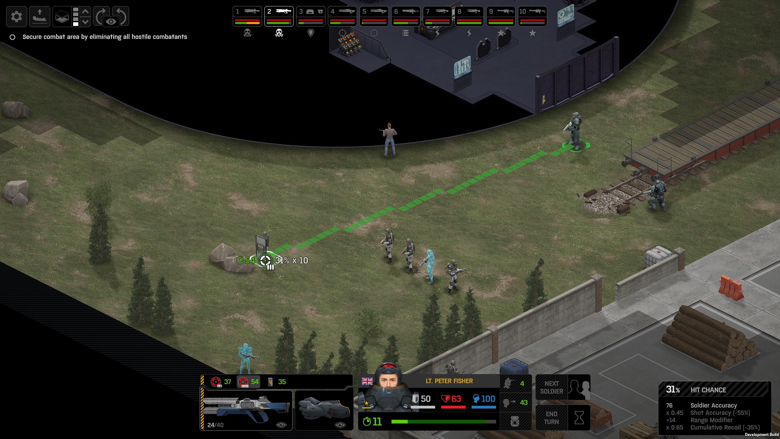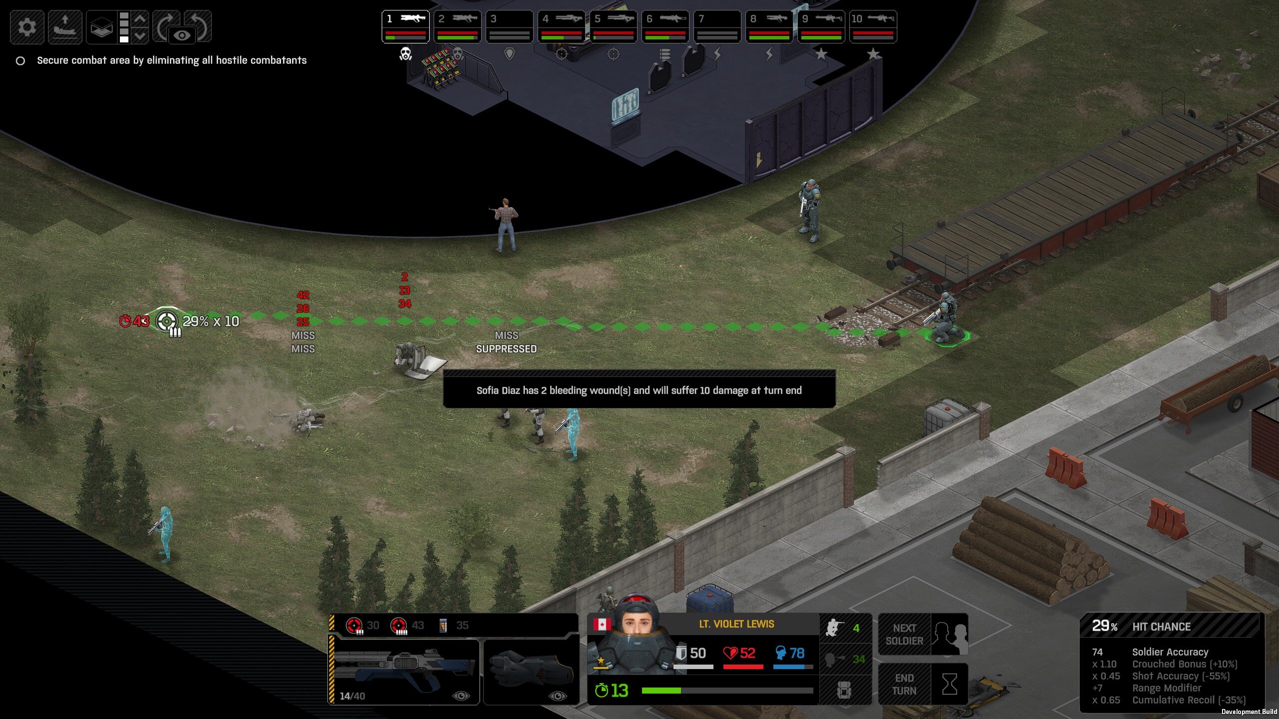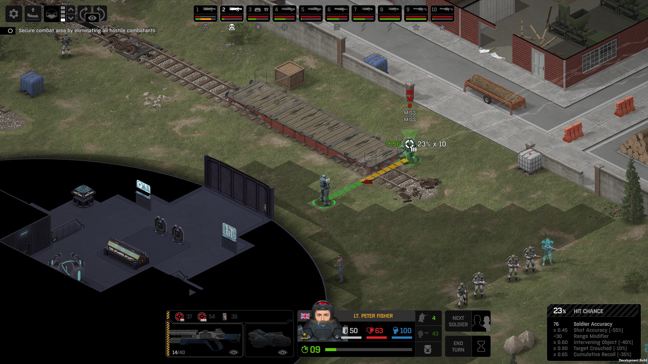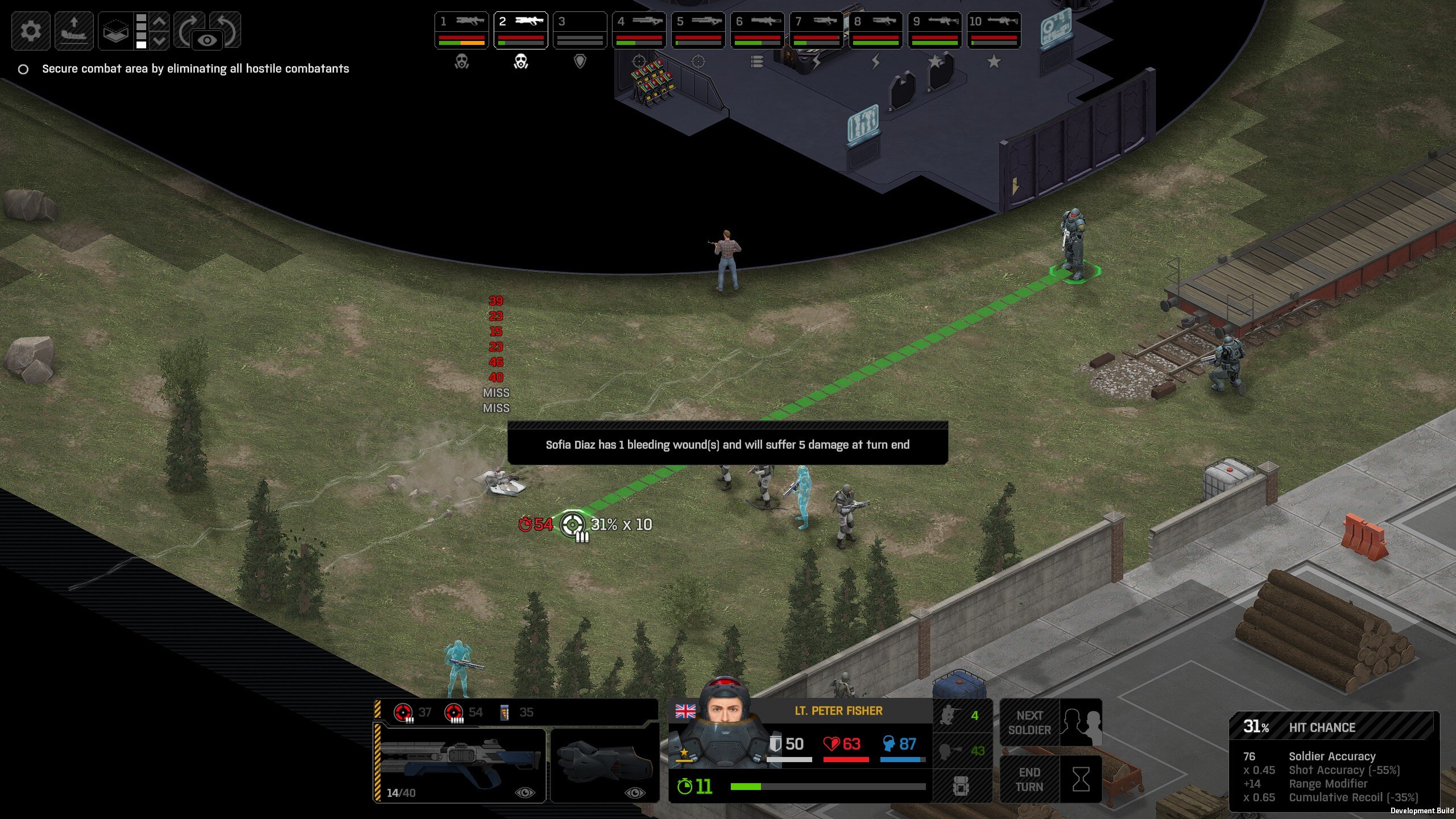 Missed shots ignore accuracy. Weather that is a bug, a feature, a hack, an exploit. It is present. It effects grenades, burst weapons, weapon balance, weapon feel, AI behavior, and so much more (soldier survival, meta decisions, etc). You guys have programed at least 2 Systems, and done at least 2 patches, specifically to stop this issue from being 'used' one by good players, and one by bad players. I don't have a 100 Accuracy Soldier yet to test with, this 86 accuracy one can get close at 51 tiles. Its hard to even get the camera to follow the shot: At 48 tiles, same thing: At Exactly -160 (where the 100 accuracy sniper would go from 1% to 0%): The miss on the right was actually a 0 damage hit the game thought was a miss. Now, there was still a deviated shot at this range, so my next assumption is (86 + 8 -3)*1.60 -x= 0, which is 40.56 tiles: There is some deviation here still. So closer. 0 Damage hit again, going through 3x 99% cover. Still some deviation though: Not much though: This is madness: Why does crouching and uncrouching change missed shot accuracy?
