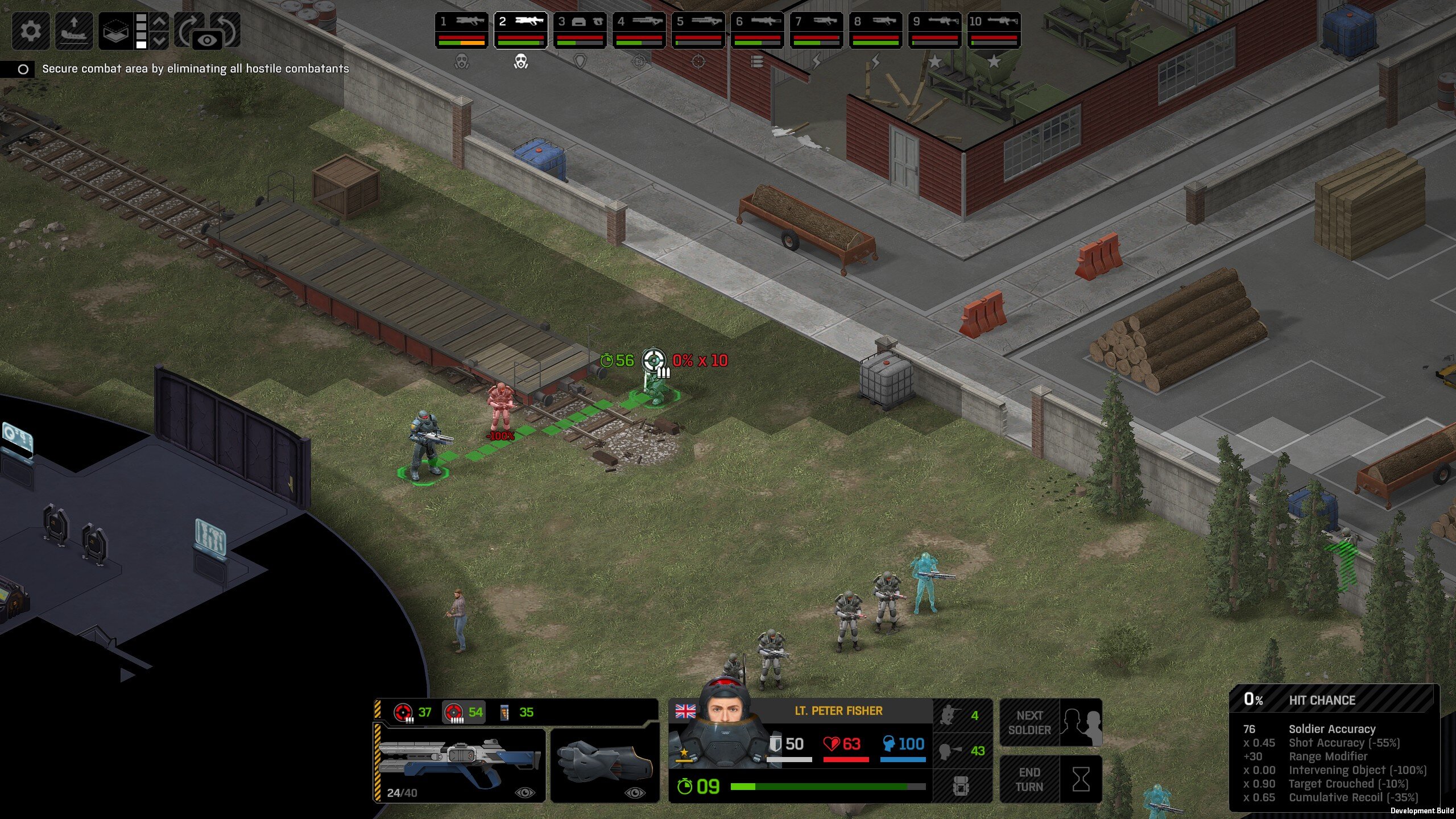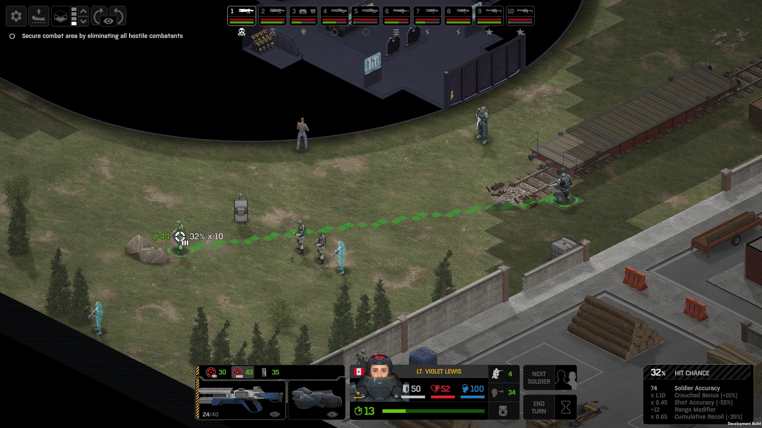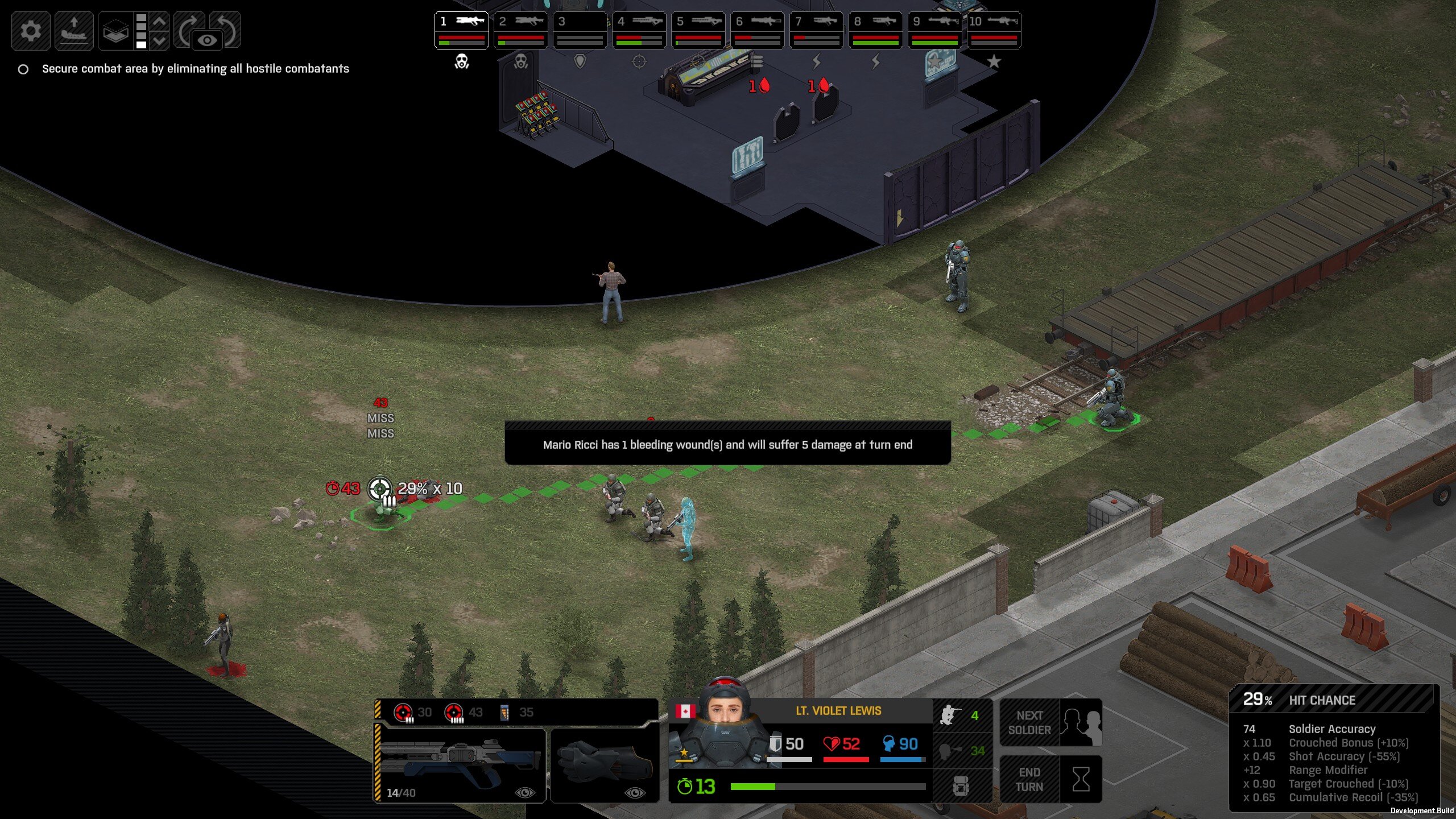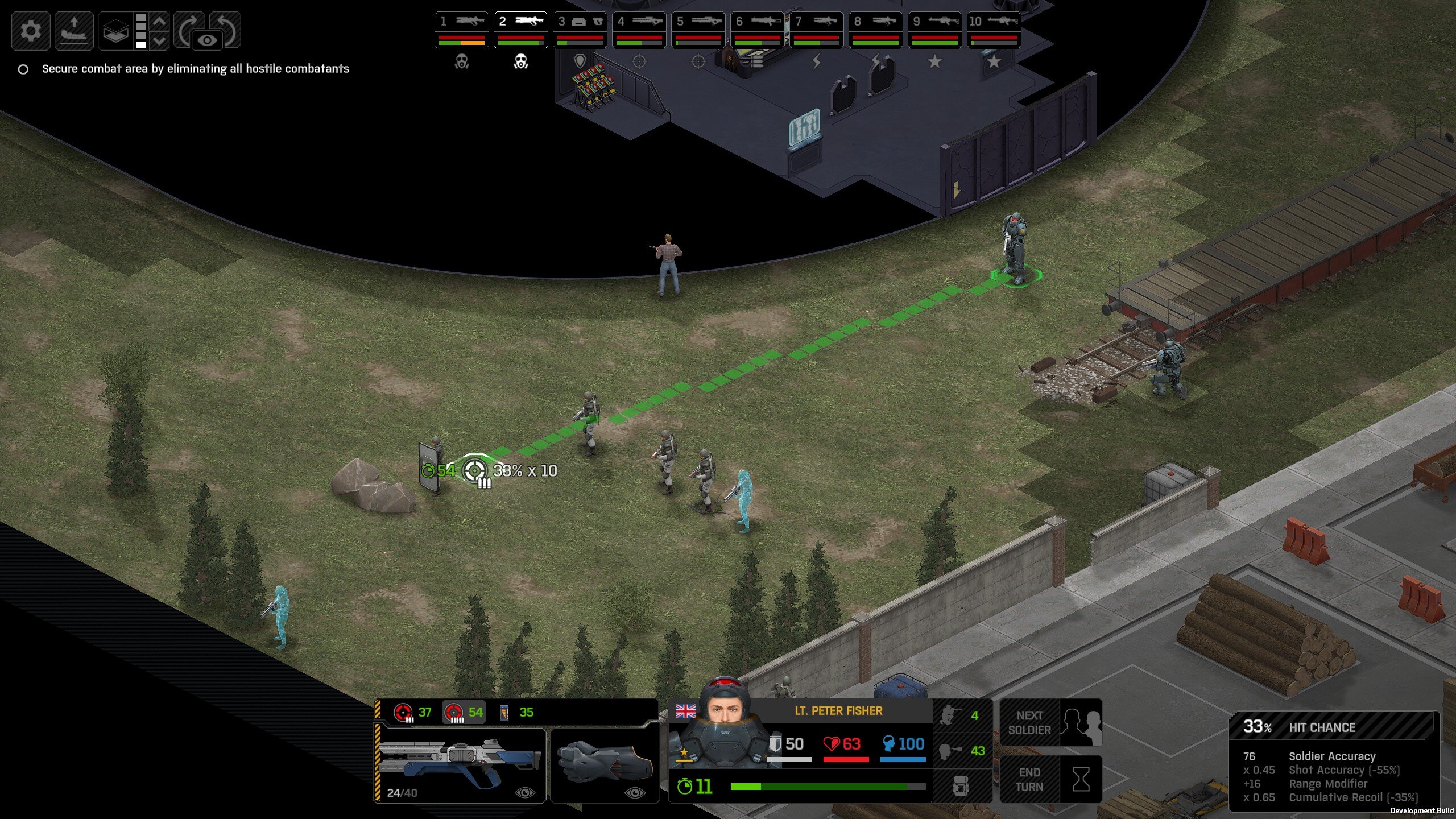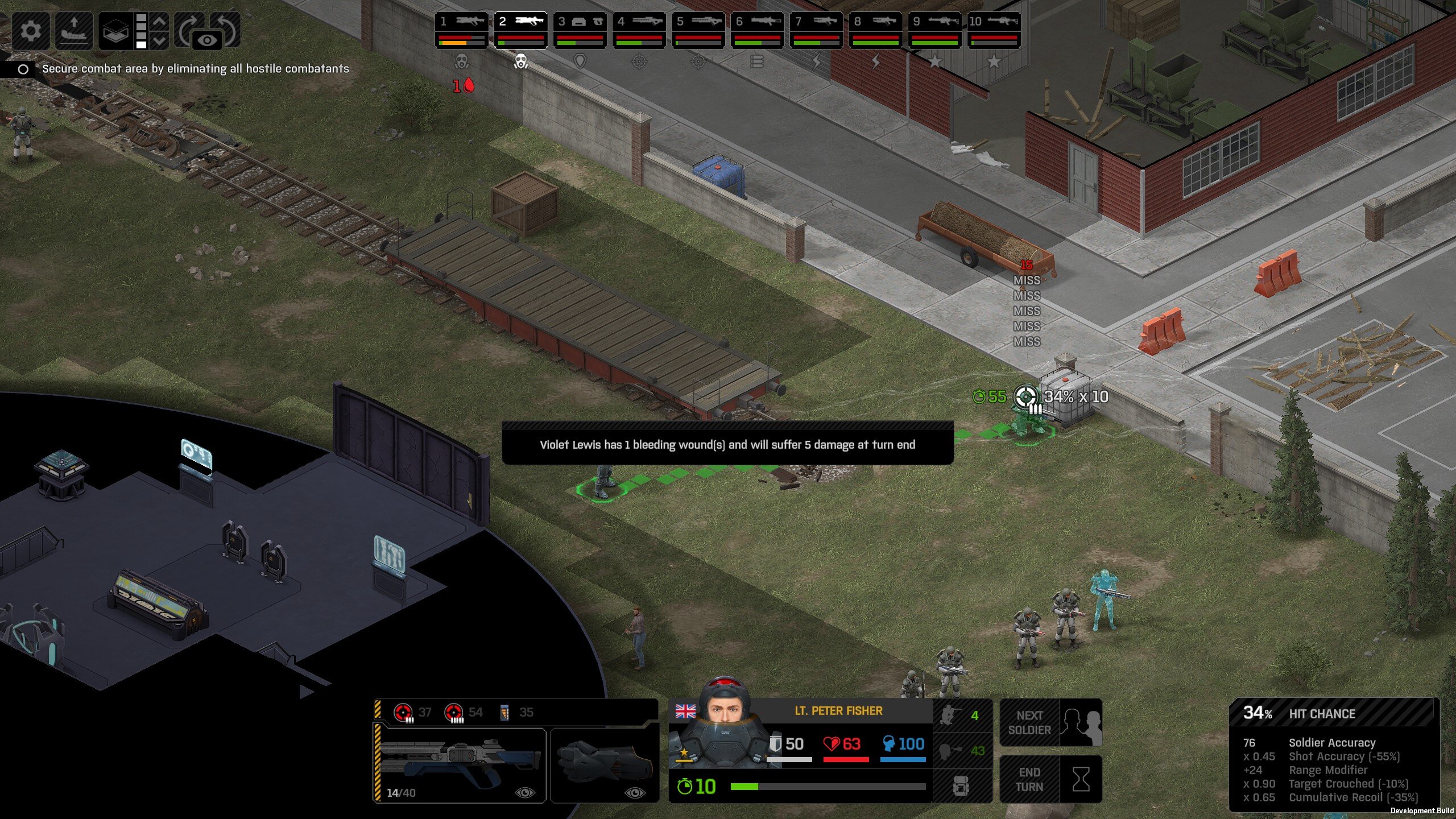 Missed shots ignore accuracy. Weather that is a bug, a feature, a hack, an exploit. It is present. It effects grenades, burst weapons, weapon balance, weapon feel, AI behavior, and so much more (soldier survival, meta decisions, etc). You guys have programed at least 2 Systems, and done at least 2 patches, specifically to stop this issue from being 'used' one by good players, and one by bad players. I don't have a 100 Accuracy Soldier yet to test with, this 86 accuracy one can get close at 51 tiles. Its hard to even get the camera to follow the shot: At 48 tiles, same thing: At Exactly -160 (where the 100 accuracy sniper would go from 1% to 0%): The miss on the right was actually a 0 damage hit the game thought was a miss. Now, there was still a deviated shot at this range, so my next assumption is (86 + 8 -3)*1.60 -x= 0, which is 40.56 tiles: There is some deviation here still. So closer. 0 Damage hit again, going through 3x 99% cover. Still some deviation though: Not much though: This is madness: Why does crouching and uncrouching change missed shot accuracy?