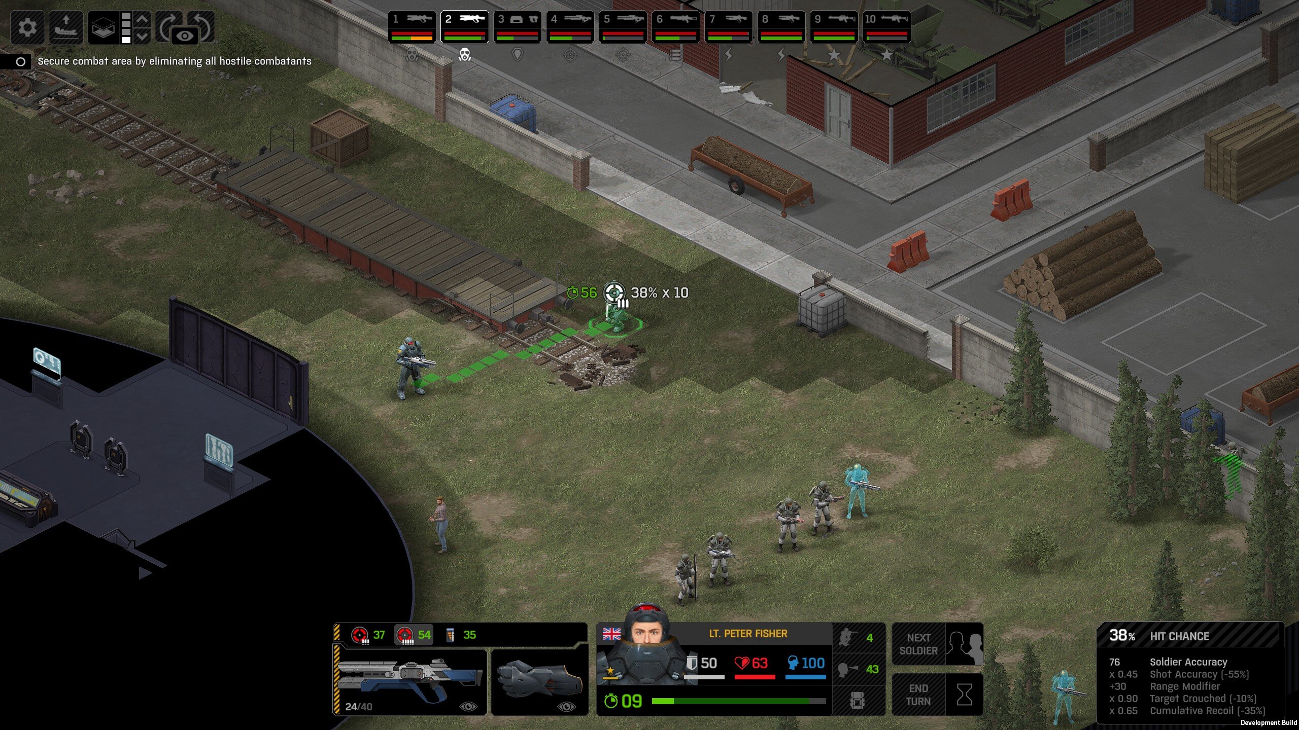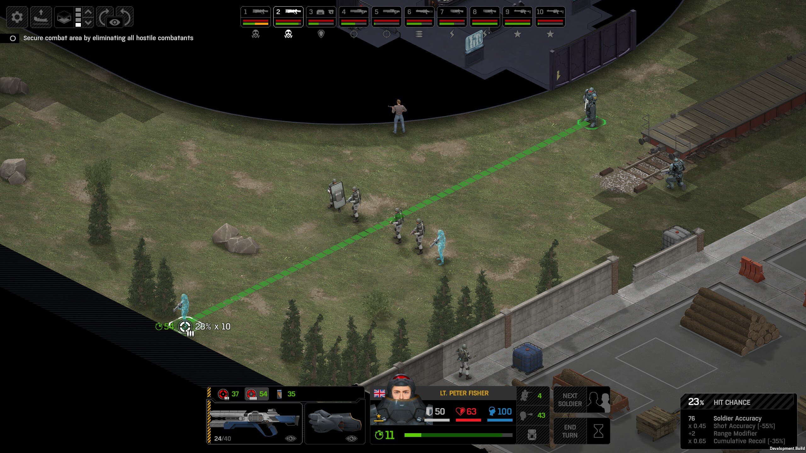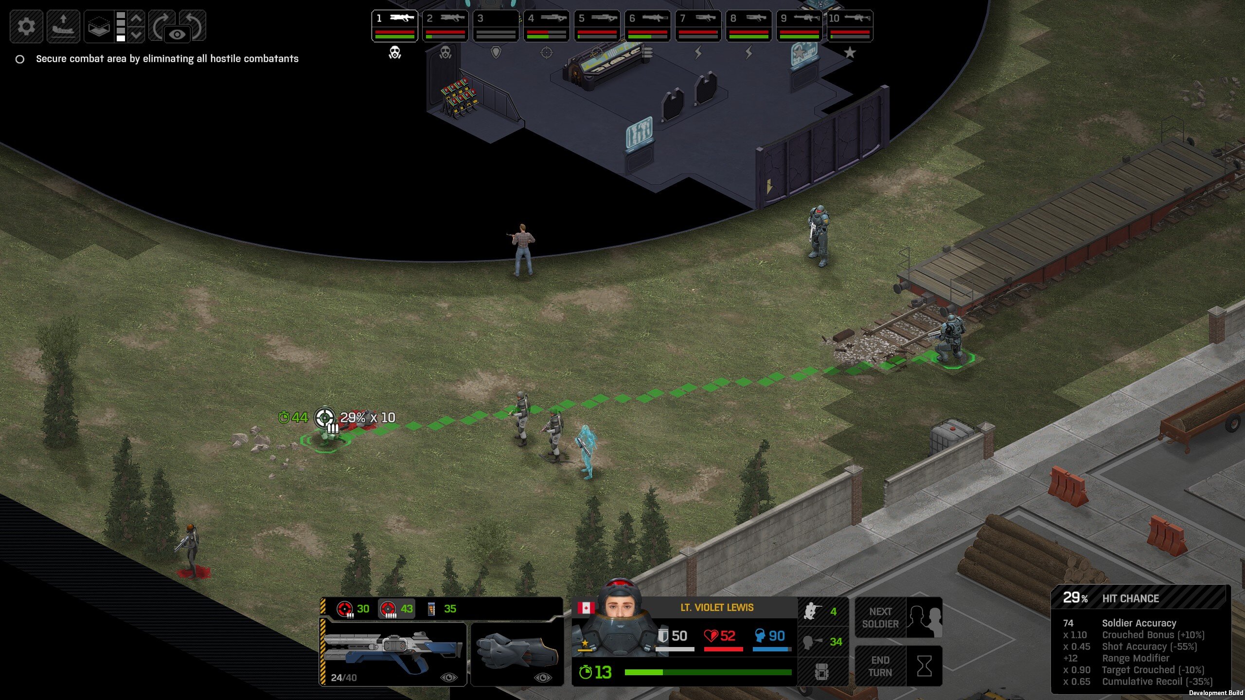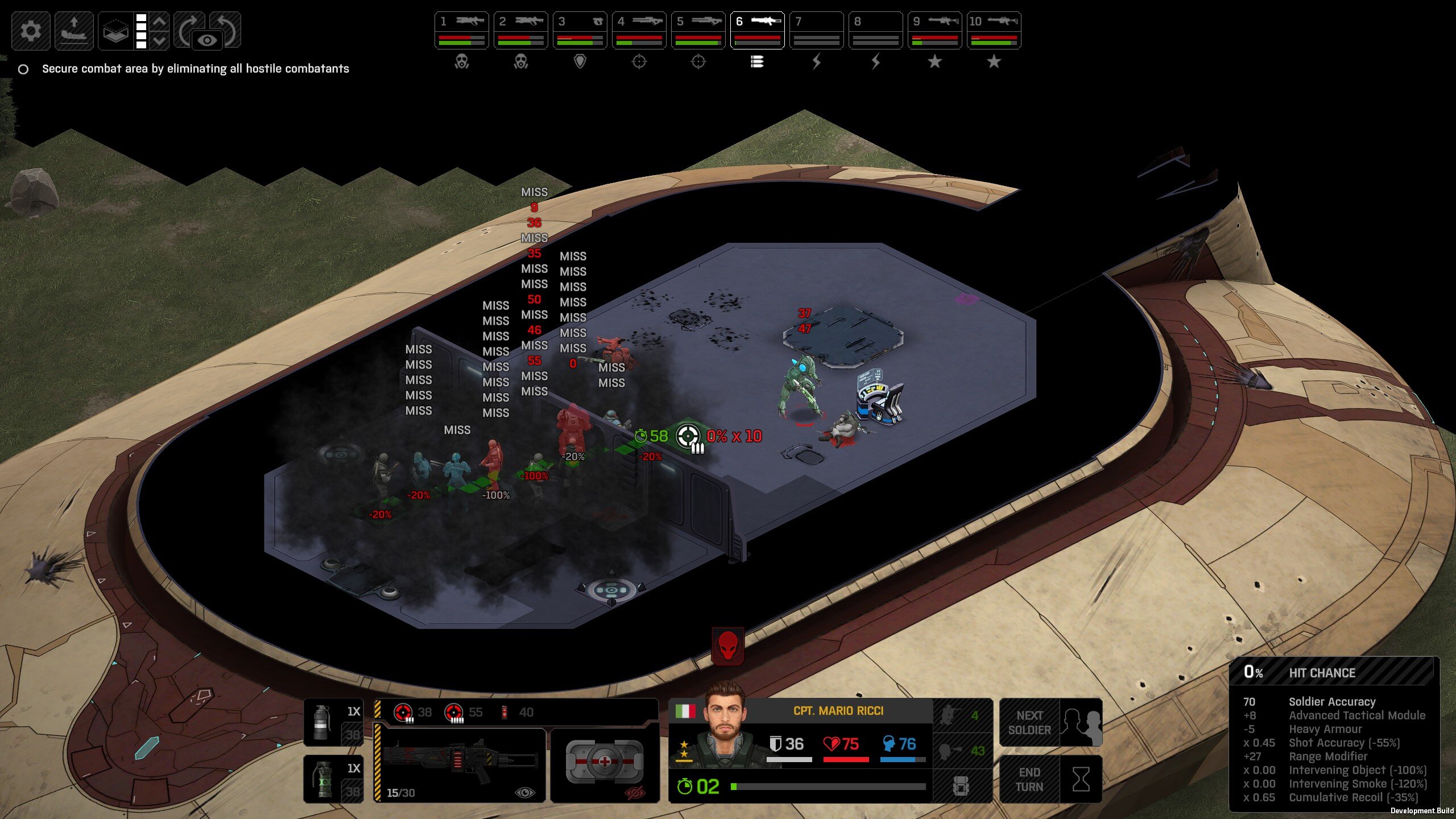 Missed shots ignore accuracy. Weather that is a bug, a feature, a hack, an exploit. It is present. It effects grenades, burst weapons, weapon balance, weapon feel, AI behavior, and so much more (soldier survival, meta decisions, etc). You guys have programed at least 2 Systems, and done at least 2 patches, specifically to stop this issue from being 'used' one by good players, and one by bad players. I don't have a 100 Accuracy Soldier yet to test with, this 86 accuracy one can get close at 51 tiles. Its hard to even get the camera to follow the shot: At 48 tiles, same thing: At Exactly -160 (where the 100 accuracy sniper would go from 1% to 0%): The miss on the right was actually a 0 damage hit the game thought was a miss. Now, there was still a deviated shot at this range, so my next assumption is (86 + 8 -3)*1.60 -x= 0, which is 40.56 tiles: There is some deviation here still. So closer. 0 Damage hit again, going through 3x 99% cover. Still some deviation though: Not much though: This is madness: Why does crouching and uncrouching change missed shot accuracy?
