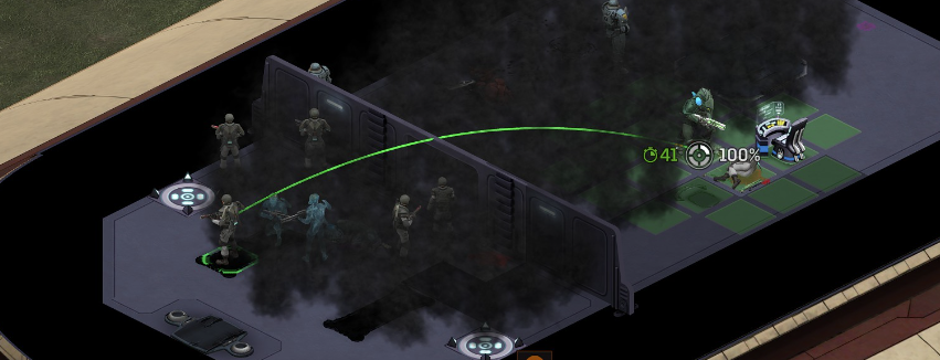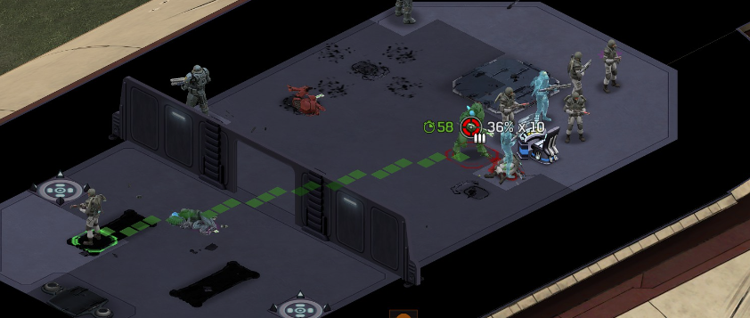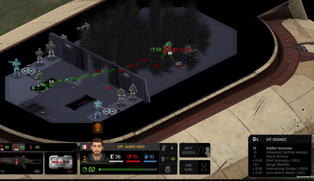 Knowing all this, one might think "just smoke yourself and test that": Any addition of smoke, makes the shot unable to be taken (0% vs 0.001% issue). If we cover our soldiers as best we can with overlapping smokes, and then try to take the shot, we still can't (we know this from many posts back): We can shoot in-front of the Alien, but out of the smoke, and force hits from a 0.001%. Also the friendlies are safe-ish. Red cover dies, shots turn into accurate misses, and hit the alien, which was not the target.