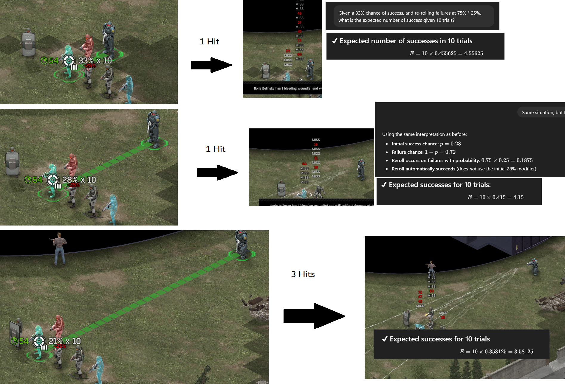 I was miss-understanding the damage randomness. I thought it would only choose those values, not that it could chose a floating point result between 0.5 and 2.0. I will keep an eye out for any shots that might show otherwise, but in the meantime it should be safe to assume it is working correct (I literally don't even pay attention to how much damage my shots do in normal play, I only remembered there was damage randomization when I rolled over 120 on a sniper). Essentially, it has to or my evolved play-style would be different. I am having difficulties generating a test case that proves this conclusively and not just via statistics, but it seemed like the Deviation chance in 6.24.0 had made this even harder. Then it occurred to me that I have been using soldiers as stand-ins for 'cover/obstacles' every time I was trying to test this (other than smoke). I will have to setup a new test situation to confirm this, but in the meantime these are examples of 'Accurate Misses' with the sniper rifle taking 100% shots against a target behind 99% 'cover'. The shot cannot hit the cloaked soldier as a "miss" because we have pushed misses off the 'combat table' with 100% hit. The 'miss roll' never even gets rolled here because we are using an Accurate Shot, but the game will still show the Miss over Soldiers/Aliens/Civilians (not cover/objects). This also shows that accurate misses don't deviate, they will hit the 'red cover', and then the next red cover as that gets destroyed or becomes invalid (suppression ducking, etc). Misses Below is the type of shot that I was expecting to be able to generate with ease using 99% StoppingChance to show missed shots hitting, but would run into several issues (Target would die before taking 8+ hits, and deviation seemed to start working more reliably as the 6.24.0 fix). This picture should have been easy to make at 99% and it should be a 1 in 500+ chance at 0% StoppingChance, but it showed up on my first 0% shot (~44% Displayed Accuracy): While at the same time, these picture have 99% StoppingChance, and things I expected to die did not die again: The shield in-front dying is expected (accurate hits), and the sniper in the back getting hit is expected (accurate misses), but the shots missing the soldier next to the cloaked sniper should be impossible (unless I lost track of my variable settings, but I don't think I did). My current suspicion is that 'inanimate objects' behind the target are artificially increasing hit chance, regardless of 'StoppingComponent' value, I believe this shot was so accurate because the rock (and a tree) was behind the target: And that 'live targets' behind the target might be reducing hit chance: These results would explain my 'High Accuracy Burst Reaction Fire' that I have been seeing from my Machine Gun soldiers. Post 6.24.0 shows the 'force the miss to hit something else, even if we spin' system IS present like you said, I had just not noticed before due to deviation and high accuracy soldier. Further Testing Required Still I am unable to currently determine why sometimes it seems like I can do massive overkill to a target, but sometimes they die on the 3rd shot (when 4-6 should hit) and the others miss (I expected 8-10 hits here, but did the target die early?): This is also causing troubles with testing, as I am not sure if the target is just dying or if they are being missed normally. I might have to try to generate a save with a high-hp alien to test, but that will take some considerable time to arrange. Cover taking Priority The issue with cover becoming relatively more powerful at Accuracies under 100%, and less powerful over 100% still remains, and will be a large factor in balancing the Shotgun/MG/Rifle against the Sniper/Pistol. The 'simple' fix is to give the Shotgun/MG accuracies over 100%, take away their range bonus, and lower MG range slightly (their range will stop it from being an issue). Adding a -2 or even -5 range bonus on the sniper would probably make it feel more correct (its cover penetrating ability would scale with range, where it does not currently). The pistol and rifles can essentially choose to shoot fairly (100% shot) or shoot at cover (snap shots/burst). This is why lasers are busted. The sniper can choose to shoot fairly (100% shot) or invalidate most cover (160% shot ignores 37.5% cover), making the choice a non-choice unless the target is in the open and you moved to get the shot. The rifles being able to choose between, very low single shot, very low burst shot, 100%+ shot, make them the best weapons, but mostly Laser/Fusion. The Cleaner weapon was a specialty 'close range sniper' rifle, and the alien weapons function similar. Their different range bonus actually helped this 'role distinction' by narrowing the accuracy band where it was powerful, but not making it bad elsewhere. It did not vaporize cover like the overpowered Laser Rifle (one of the 4 best weapons in the game pre-fusion) This Cover issue is a separate issue to the 'missed shots' issue, and is solely due to the math used. Save Files Apologies, my save files are getting a bit messy and I have reloaded some saves like 70+ times. I made the thread before I had ironed out all the 'smoking guns' because I had hoped to get some insight from others' experiences as well. Sniper Shot Tests (also has the guy with 25% bugged StoppingChance): user_shottest-19.jsonuser_shotmiss-24.json Machine Gun Tests user_deviationtest-22.json Smoke Sniper Test shows Forced Miss Spin and Missed Shots outside of smoke not modified by smoke to hit (only the 'miss target' being inside smoke gives protection from misses) user_shotsmokemiss-23.json