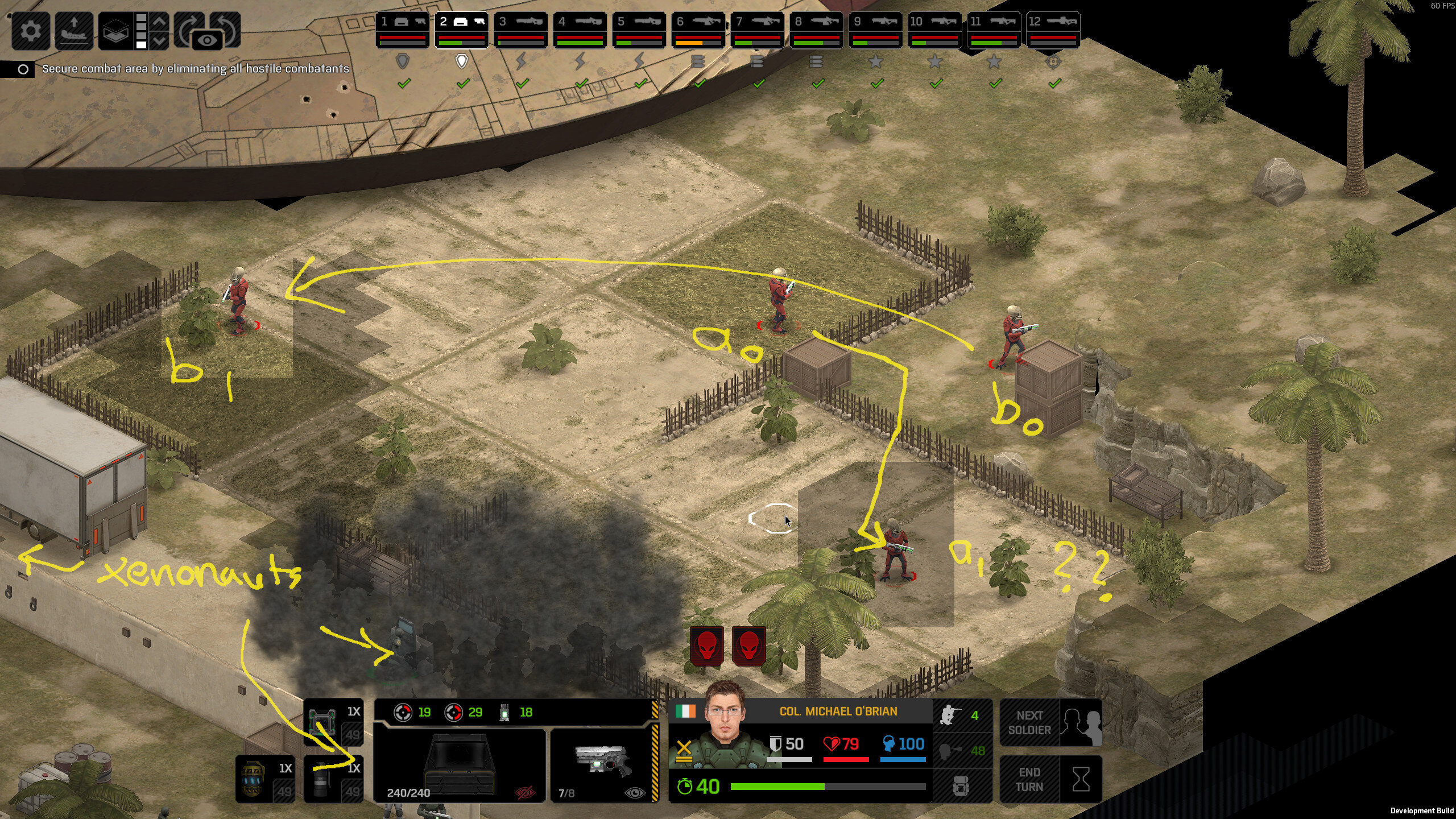 fusion-waffle Posted February 26 Posted February 26 (edited) Description Psyon, faced with xenonaut in cover in smoke, reacts by moving closer, taking cover, looking away from threat & not reserving enough TUs for reaction fire It's probably not fair to class this as a "bug" - to tune the AI you need to evaluate what it does across many different scenarios & it's probably best to focus on "does it make reasonable/fun moves 'on average'" rather than caring too much about any specific scenario. I saw there were some AI changes in 7.3.0, so here's some feedback (sample size 1) from a scenario where it did something that looked a bit silly. What Happened Curious AI behaviour Here's a composite showing start-of-alien-turn & end-of-alien-turn positioning of a pair of psyons, call them pyson A & B: At start of alien turn, no xenonauts are within line of sight of any alien. Psyon A starts at position a0, jumps the fence and makes a right 45 degree turn once 1 tile forward of the box. After this 45 degree turn, the shield xenonaut in smoke should be within Psyon A's 90 degree vision cone. But, Psyon A appears to ignore the shield xenonaut & ends its turn behind a shrub, facing away from the threat & without reserving enough TUs for a fusion rifle snap shot. I'd expect Psyon A to react to seeing the shield xenonaut. Maybe it was really looking forward to strolling over to a1 and staring at a shrub, but after seeing an enemy it could replan its move to prioritise reserving enough TUs for a snap shot & rotating so the known threat remains within its vision cone, & ideally standing behind cover (e.g. it could have taken cover behind the crate it is next to, or the fence, when the shield soldier entered its FOV cone). Further Info These AI moves seem reproducible when repeatedly loading the save. Note: the AI didn't move the psyons like this the first time I saw this situation. The first time, both psyons A & B moved to the right making "a1" type moves and staring away from the xenonaut toward the shrubs! Please see attached f11 bug report zip bug_report_2026-02-27-07h44_gc_7.3.0_user_f11_0.zip Edited February 27 by fusion-waffle Quote